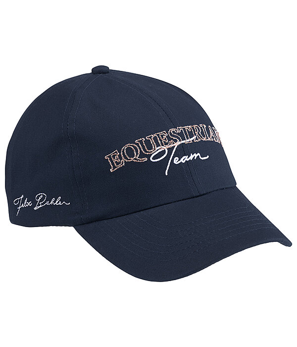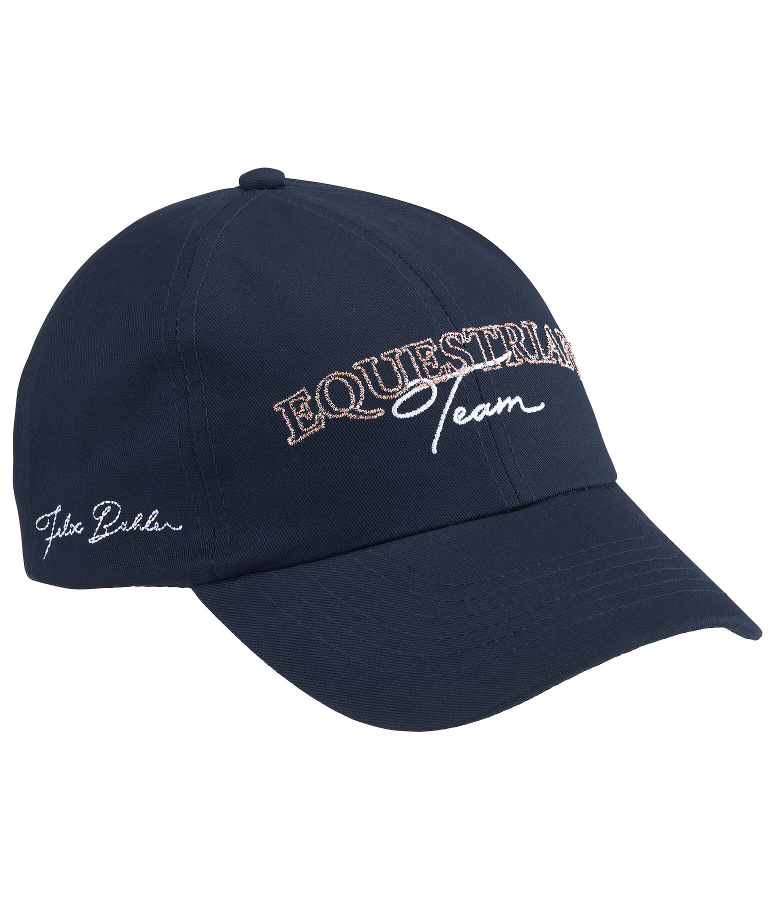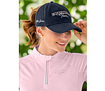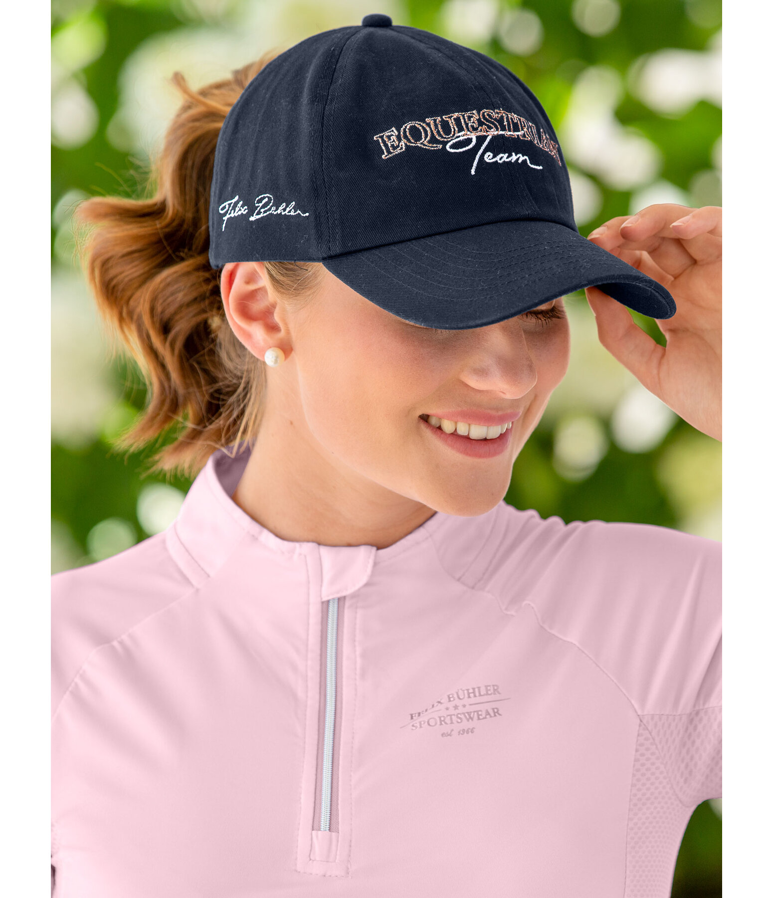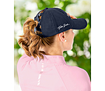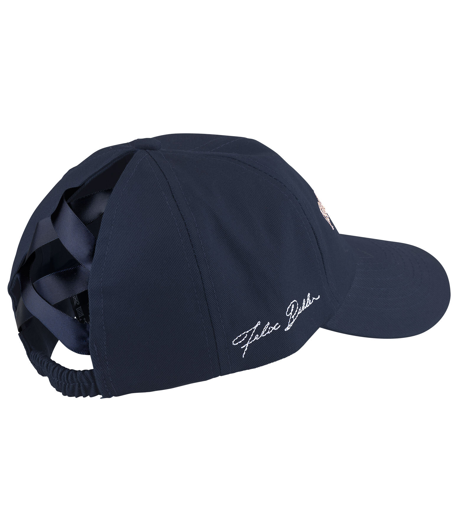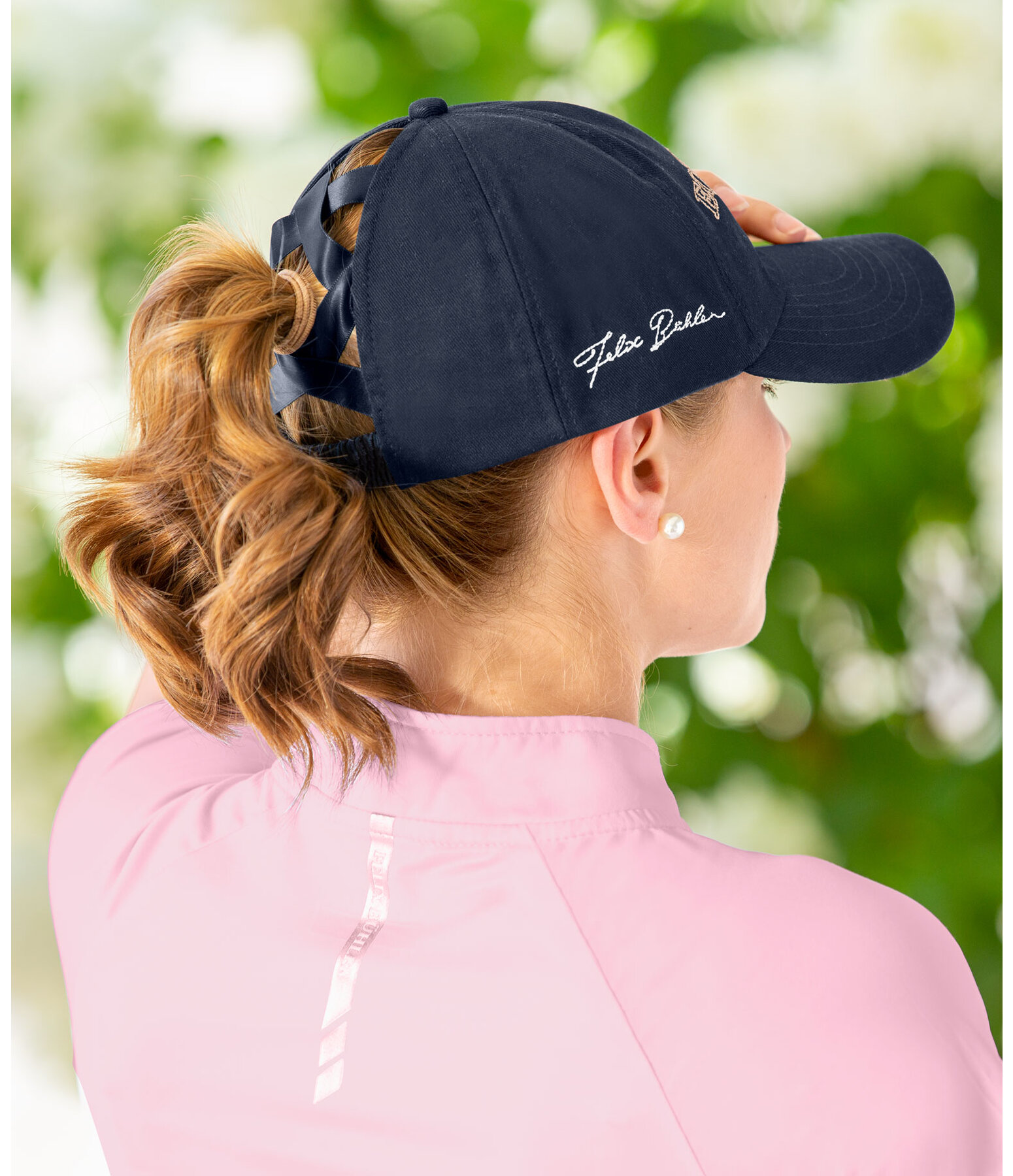 Casquette de sport brodée à l'avant et sur le côté. Bandes satinées croisées à l'arrière pour passer une queue-de-cheval à différentes hauteurs. Convient pour les cheveux très épais et les chignons. 100 % coton.