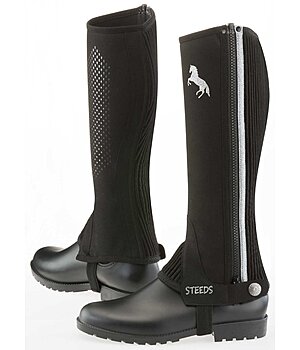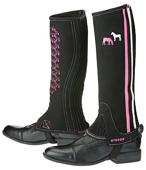 Les chaps et les mini-chaps sont près de la jambe. Bien qu'elles disposent d'inserts élastiques au niveau du cou-de-pied, elles ne sont que partiellement flexibles en largeur. C'est pourquoi les bottines d'équitation fines s'adaptent parfaitement sous les chaps et les mini-chaps, sans former de plis. Les chaussures normales ou les chaussures d'écurie sont souvent trop larges, voire trop épaisses, ce qui aurait pour effet d'écarter les chaps. De ce fait, le tissu n'adhèrerait plus correctement à la jambe et ne remplirait pas son rôle. Les crochets de certaines chaussures d'écurie peuvent également endommager la chaps. Les bottines à lacets, en revanche, sont dépourvues de tels crochets.