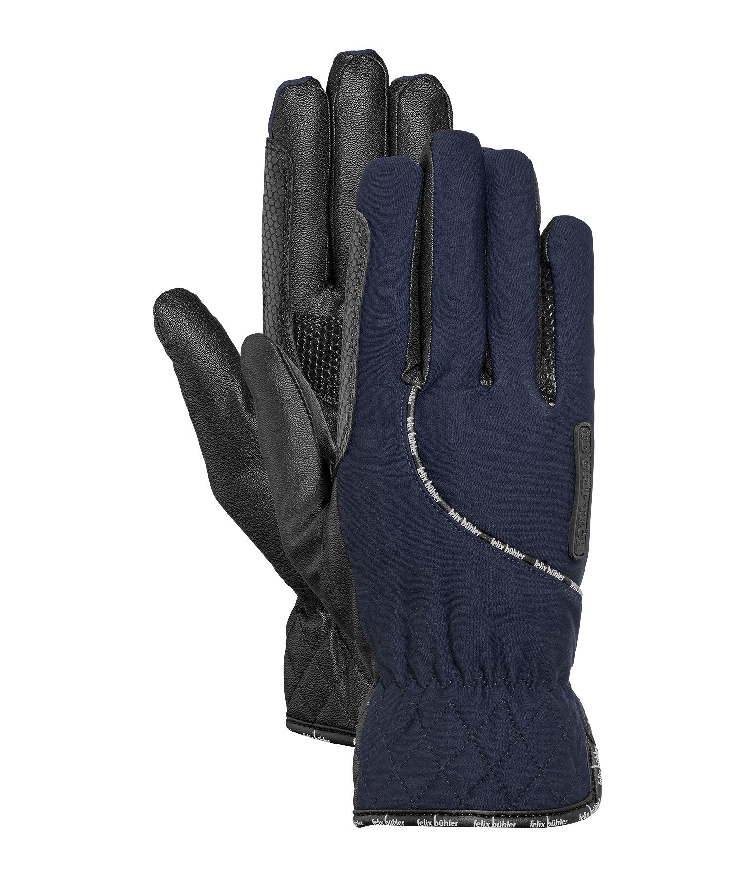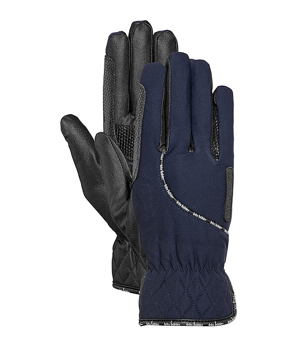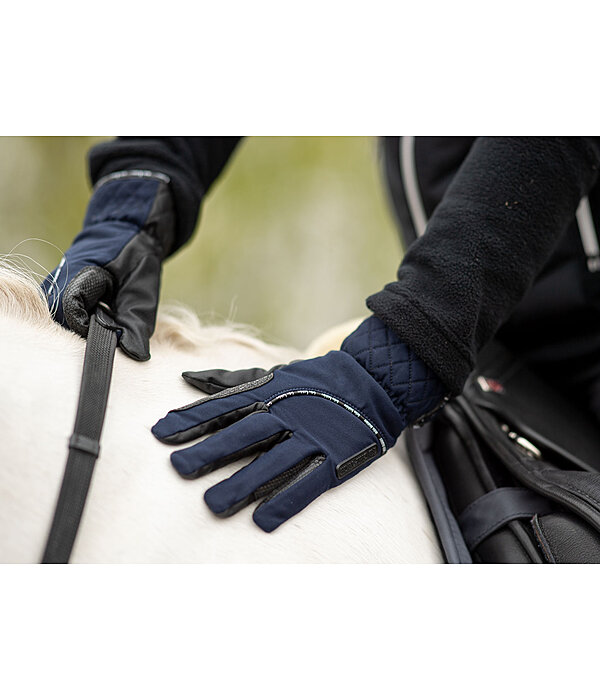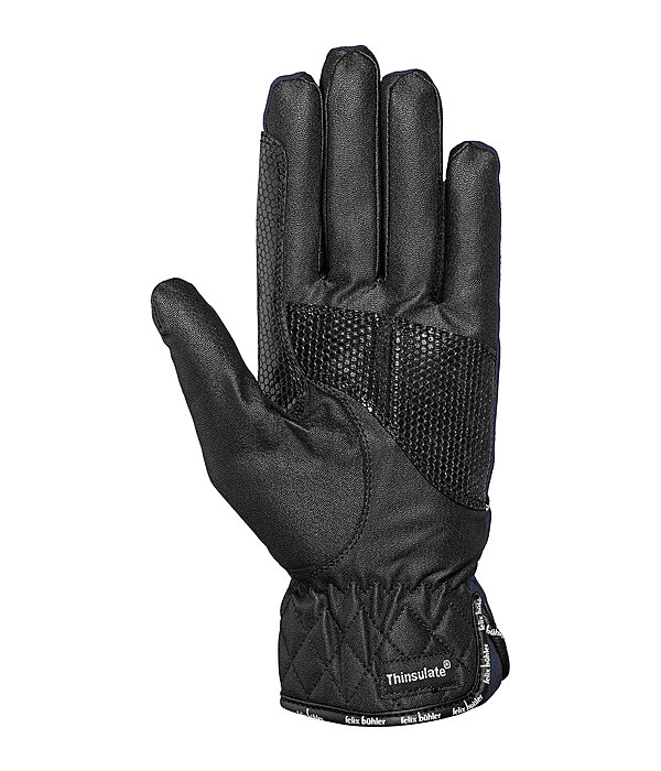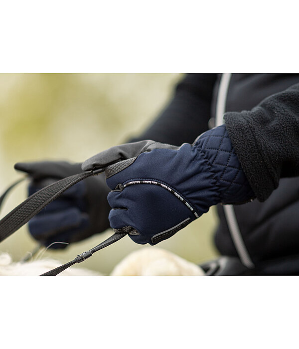 Gants d'hiver avec excellente accroche aux rênes grâce aux imprimés grip sur la matière synthétique du côté paume de la main. Déperlants, coupe-vent et respirants. Doublure Thinsulate. Dessus 87 % polyester, 13 % élasthanne. Paume 100 % polyester avec revêtement polyuréthane. Doublure 100 % polyester.