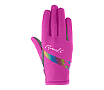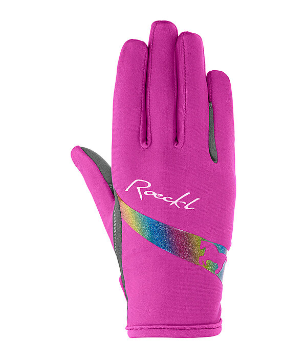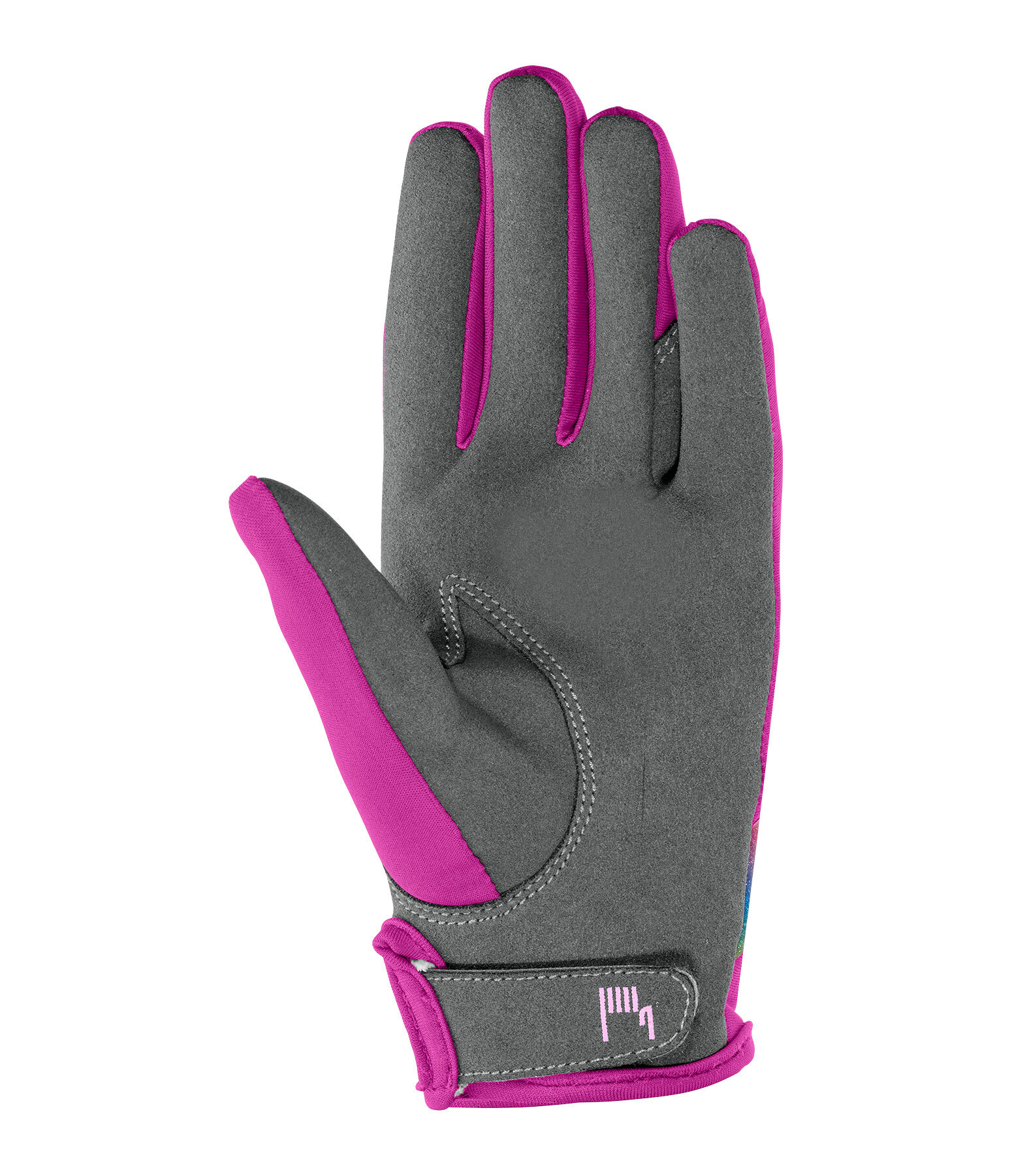 Gants d'équitation pour enfant fins et particulièrement flexibles. Design fantaisie. Dos de la main en lycra et paume en suède synthétique. Poignets avec patte auto-agrippante. Dos de la main 90 % polyester, 10 % élasthanne, paume 100 % polyamide.