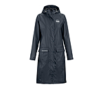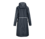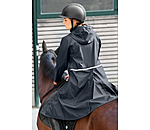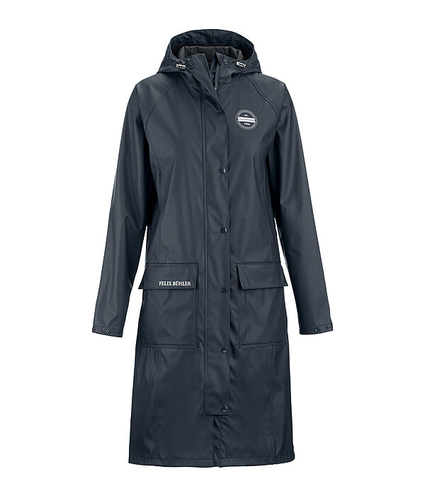 Imperméable d'équitation très long et confortable. Longue fente cavalière doublée. Capuche réglable avec système de fixation dans le dos. Imperméable (5 000 mm) et coupe-vent. Courroies de jambes réglables pour maintenir l'imperméable en place lors de la pratique de l'équitation. Fermeture à glissière double sens dissimulée avec sous-patte et protège-menton. Bas de manches réglables. 2 poches à rabat avec imprimé Felix Bühler réfléchissant. Logo réfléchissant sur la poitrine. Passepoil réfléchissant dans le dos. 100 % polyuréthane.