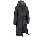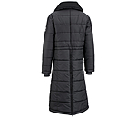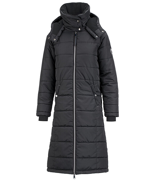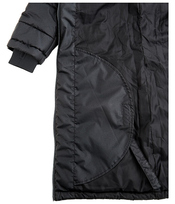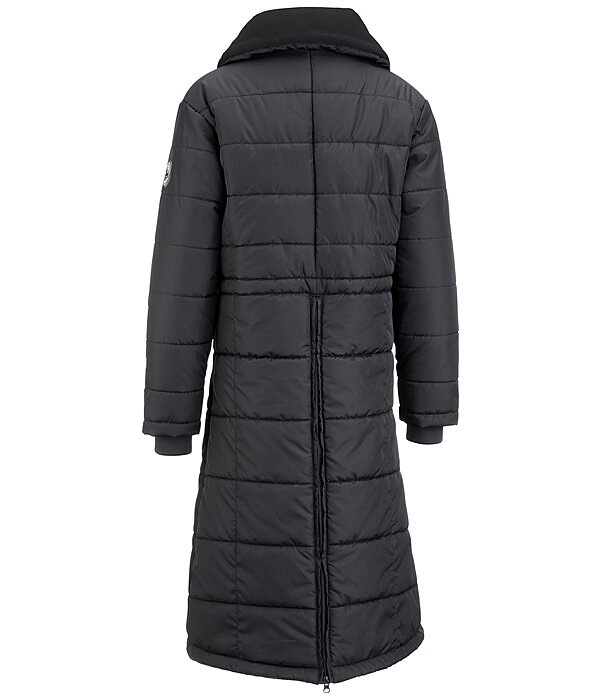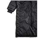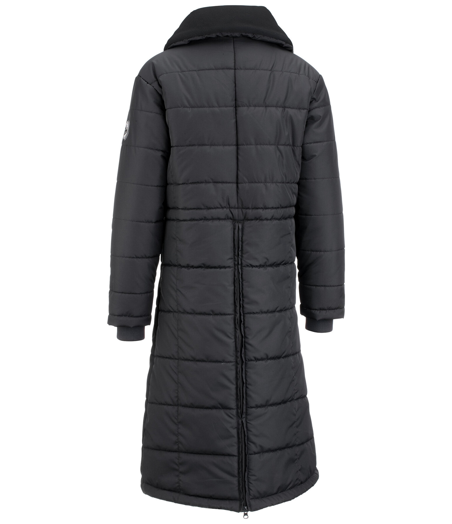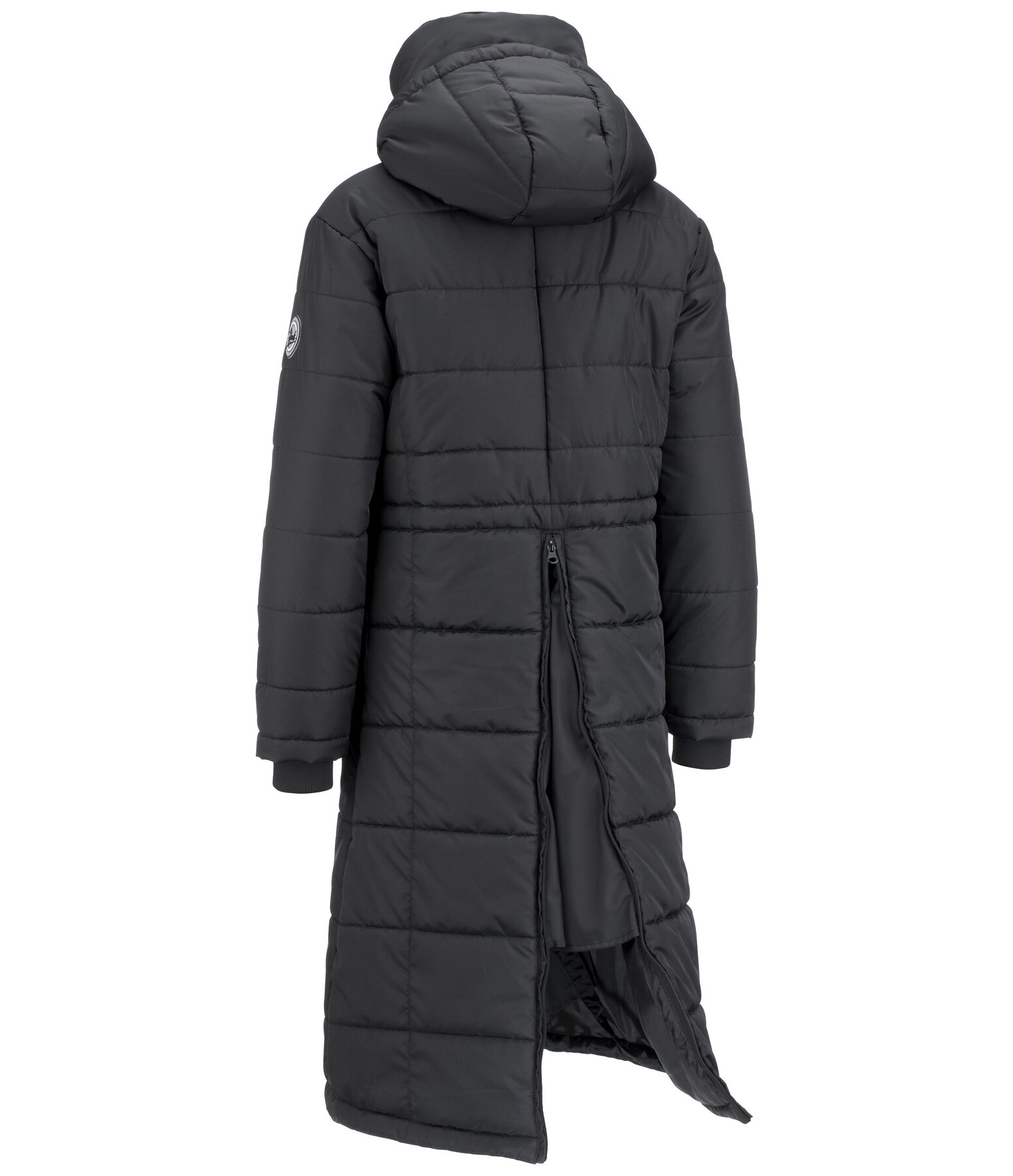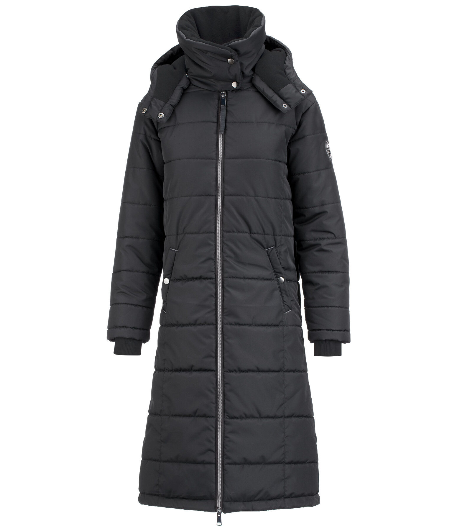 Manteau d'équitation extra long et chaud. Col haut doublé en polaire douce. Capuche doublée amovible. Bas des manches avec passe-pouce. Longue fente cavalière avec fermeture à glissière et soufflet protégeant de la pluie à l'arrière. Fermeture à glissière double sens. Courroies de cuisses. Deux grandes poches latérales avec bouton-pression et une poche intérieure zippée. Ajustable au niveau de la taille avec cordon de serrage. Rembourrage chaud. 100 % polyester.