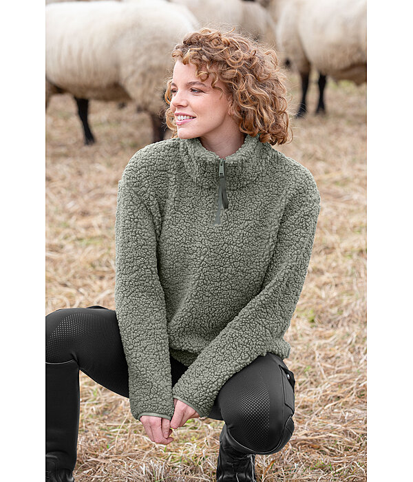 Pull-over doux en sherpa. Col montant zippé. Deux poches latérales doublées en polaire douce. Bord élastiqué en bas des manches et à la taille. Badge en tissu Felix Bühler. 100 % polyester.
