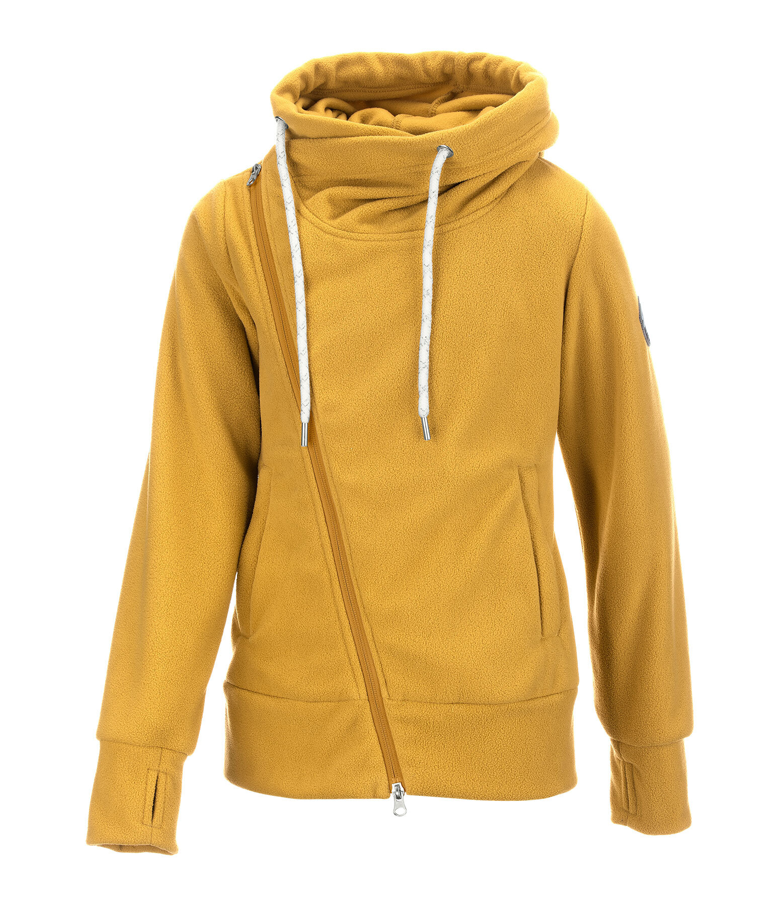 Veste polaire chaude. Large capuche ajustable avec cordon de serrage. Fermeture à glissière asymétrique bidirectionnelle. Deux poches zippées latérales dissimulées. Passe-pouce sur le bas des manches. Badge logo à la manche. 100 % polyester.