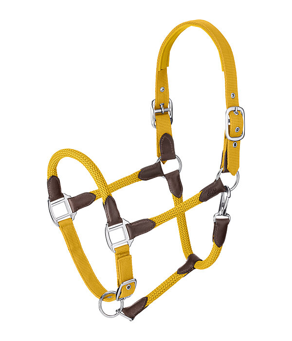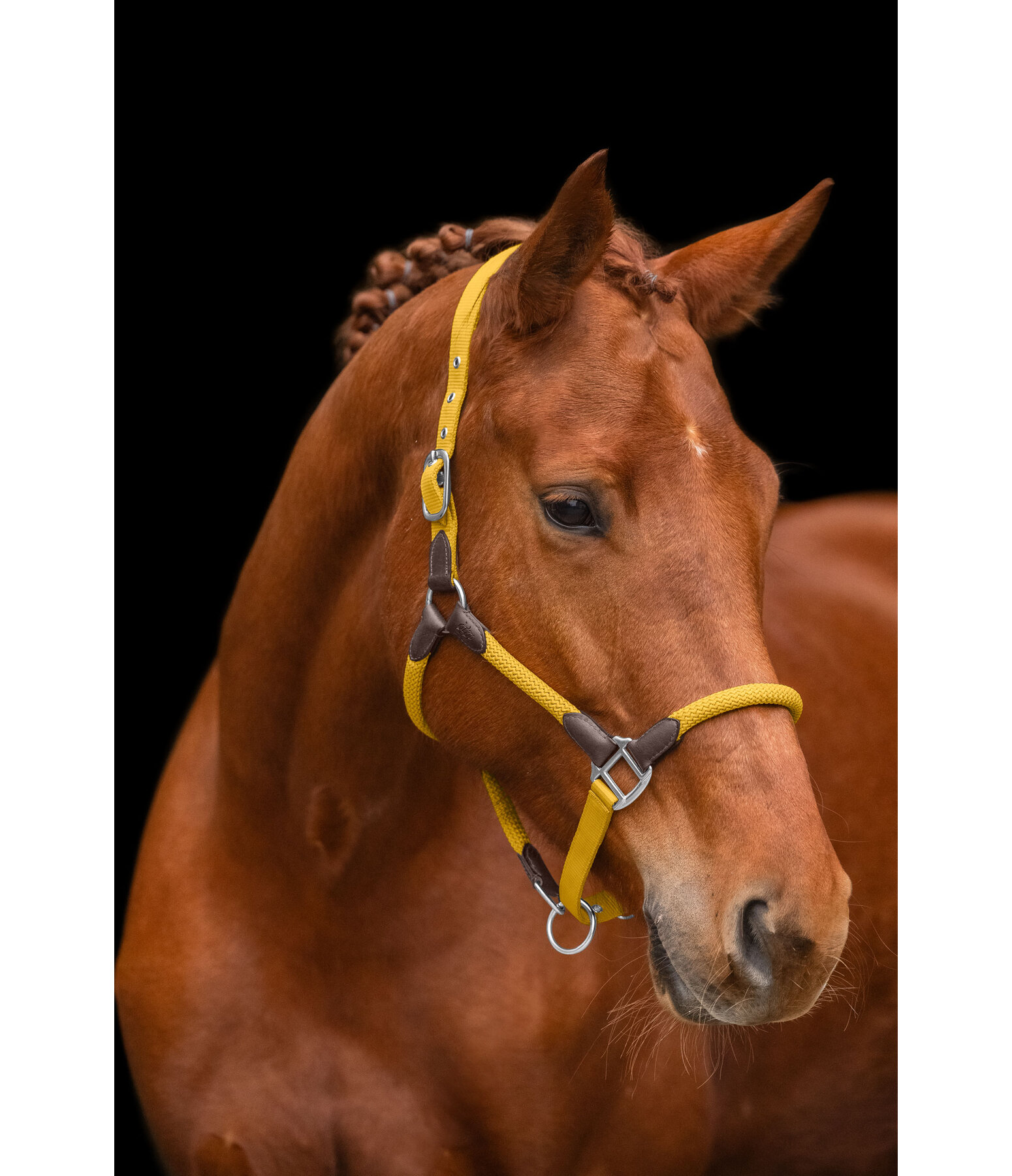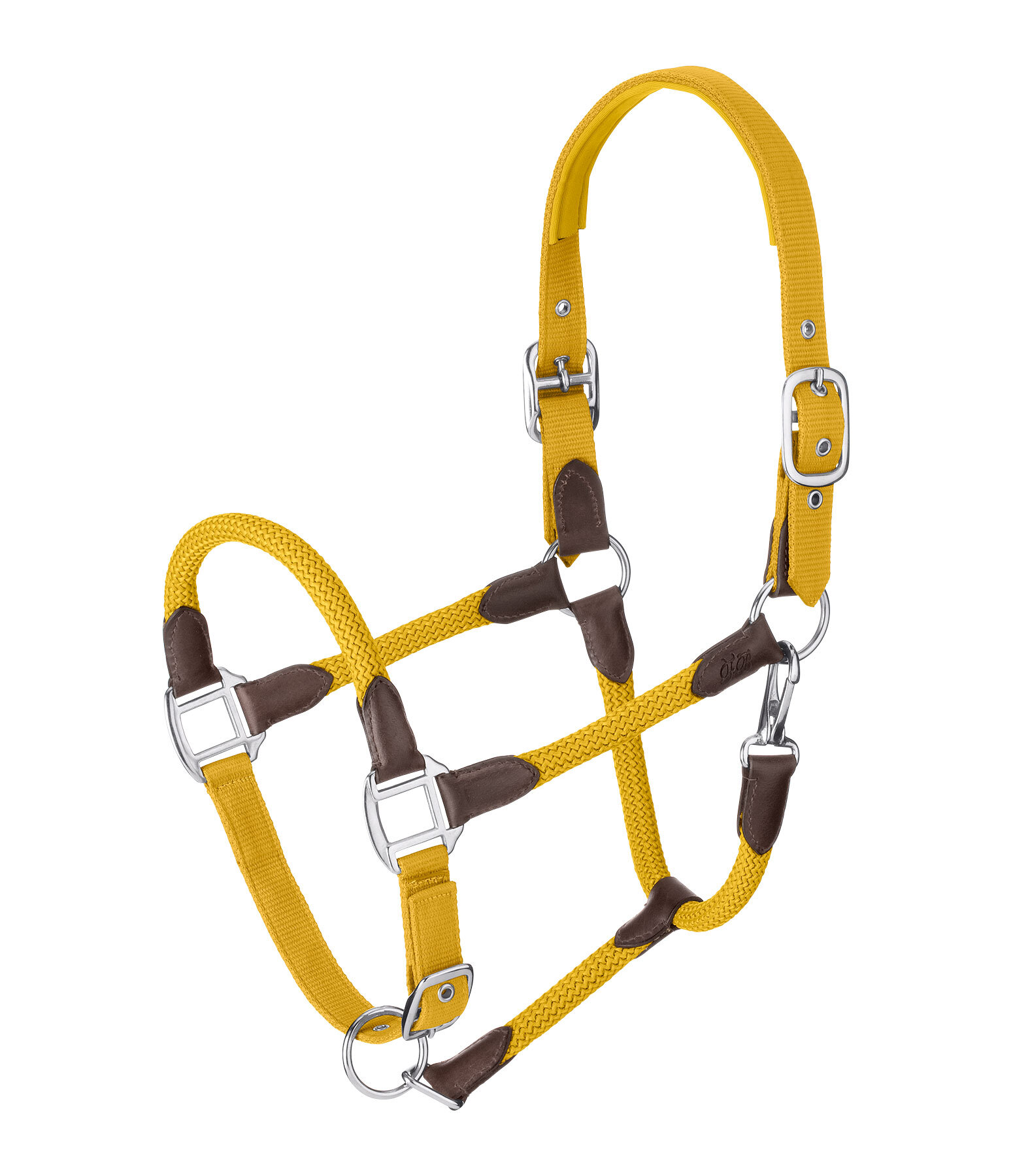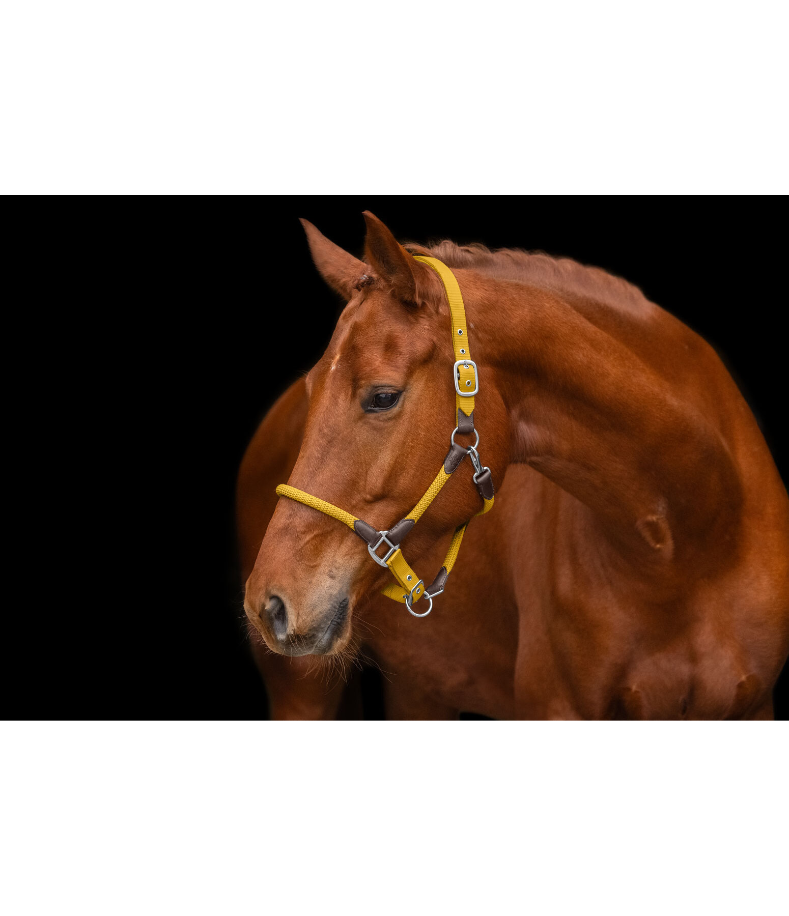 Licol exceptionnel avec corde tressée et extrêmités en cuir, qui lui confèrent un look particulièrement soigné. Assorti à la longe Kate (440 543 et 440 686). Muserolle et têtière réglables. Bouclerie argentée. Licol 100 % polypropylène, doublure 100 % caoutchouc chloroprène.