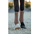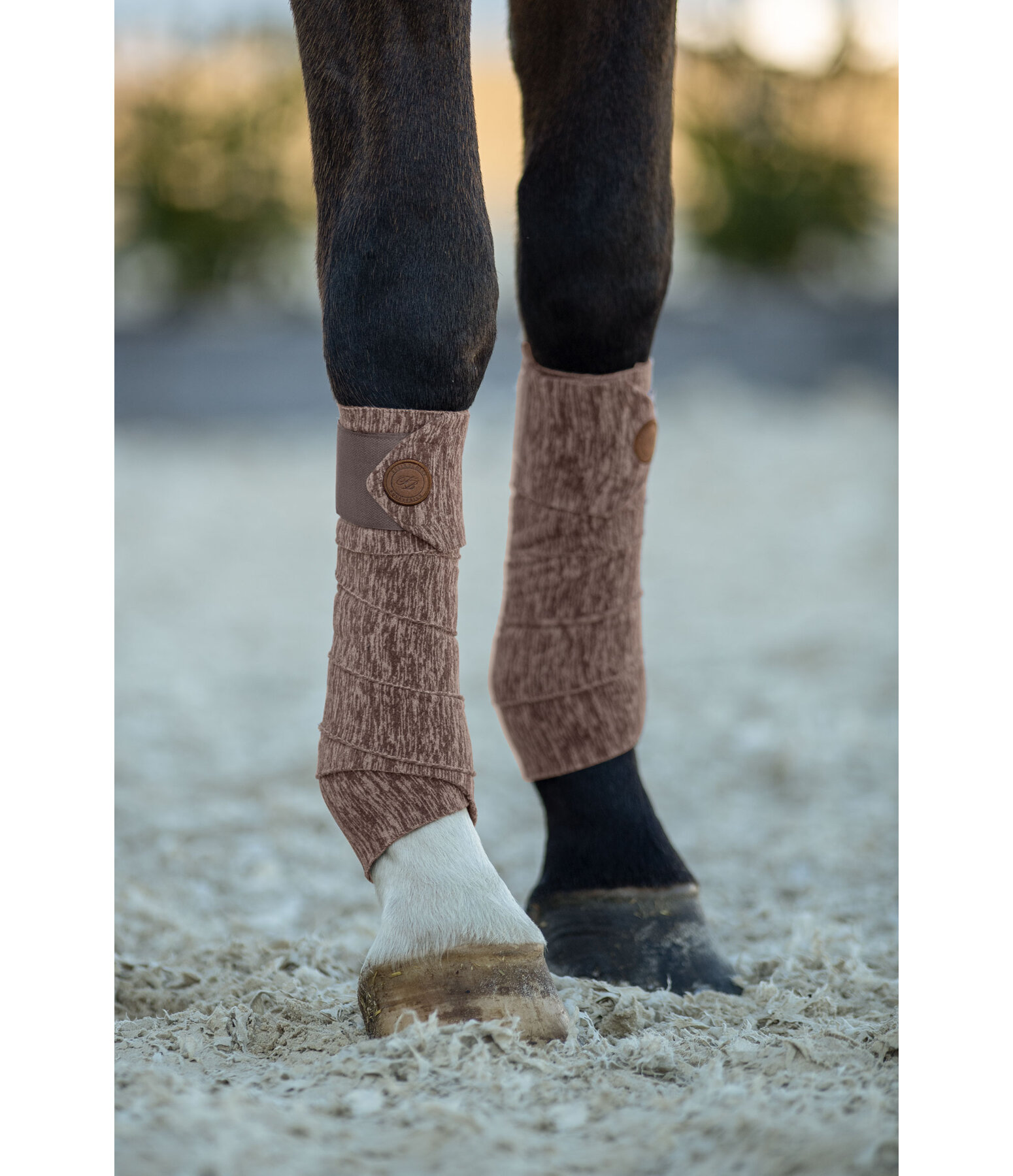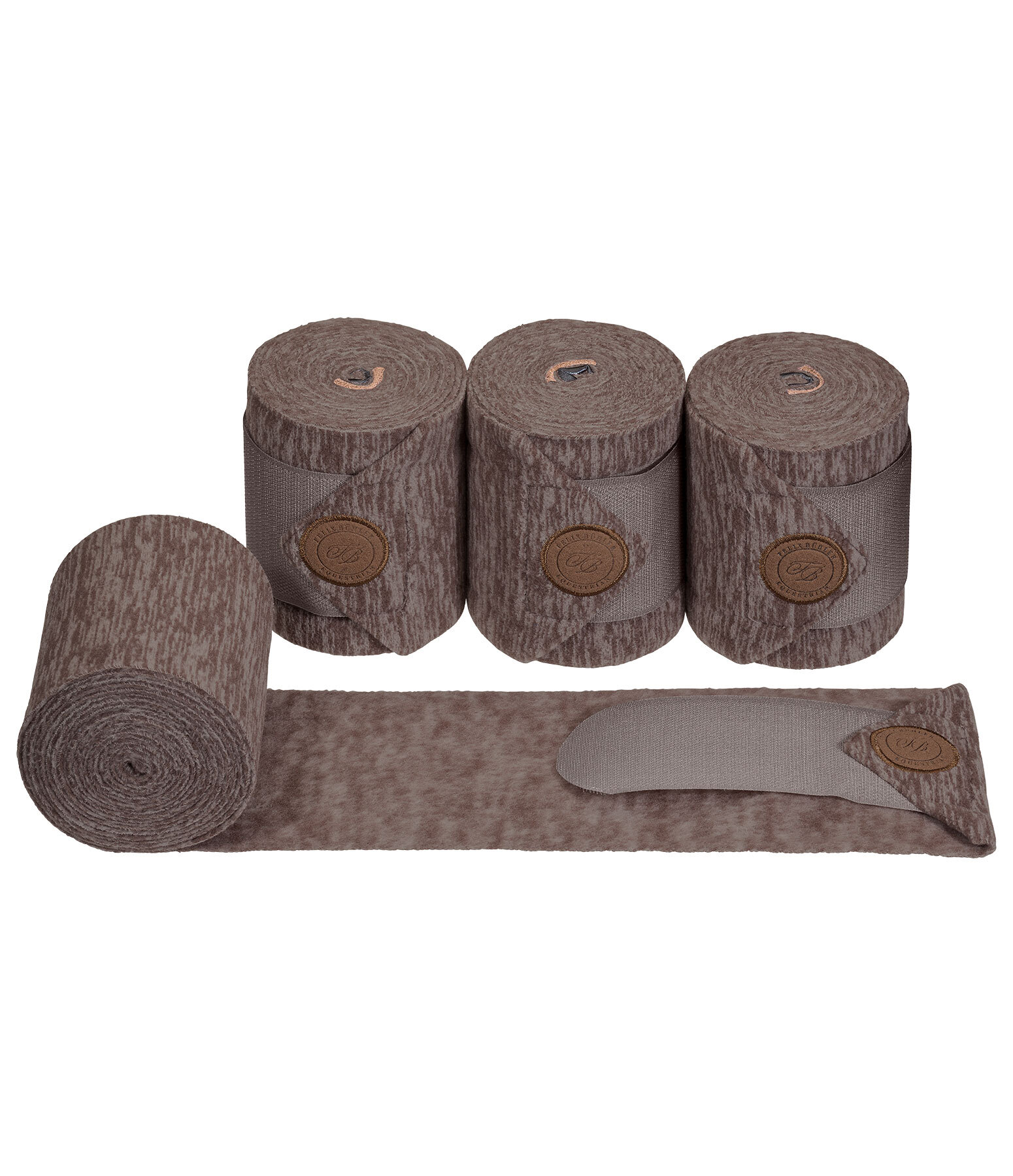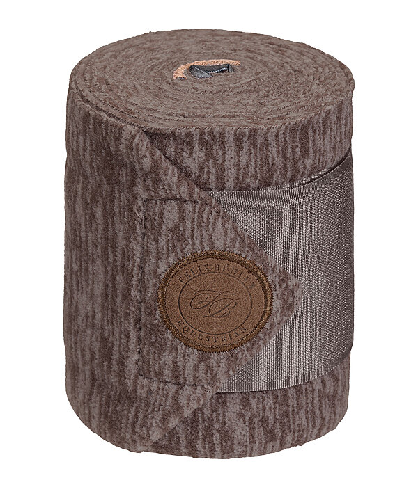 Bandes de polo en polaire douce et souple, à l'aspect tricot chiné, avec large patte auto-agrippante pour un maintien sûr et badge en velours synthétique avec logo embossé. 100 % polyester. Vendues par lot de 4. F (cheval): 320 x 11 cm, P (poney): 200 x 8 cm.