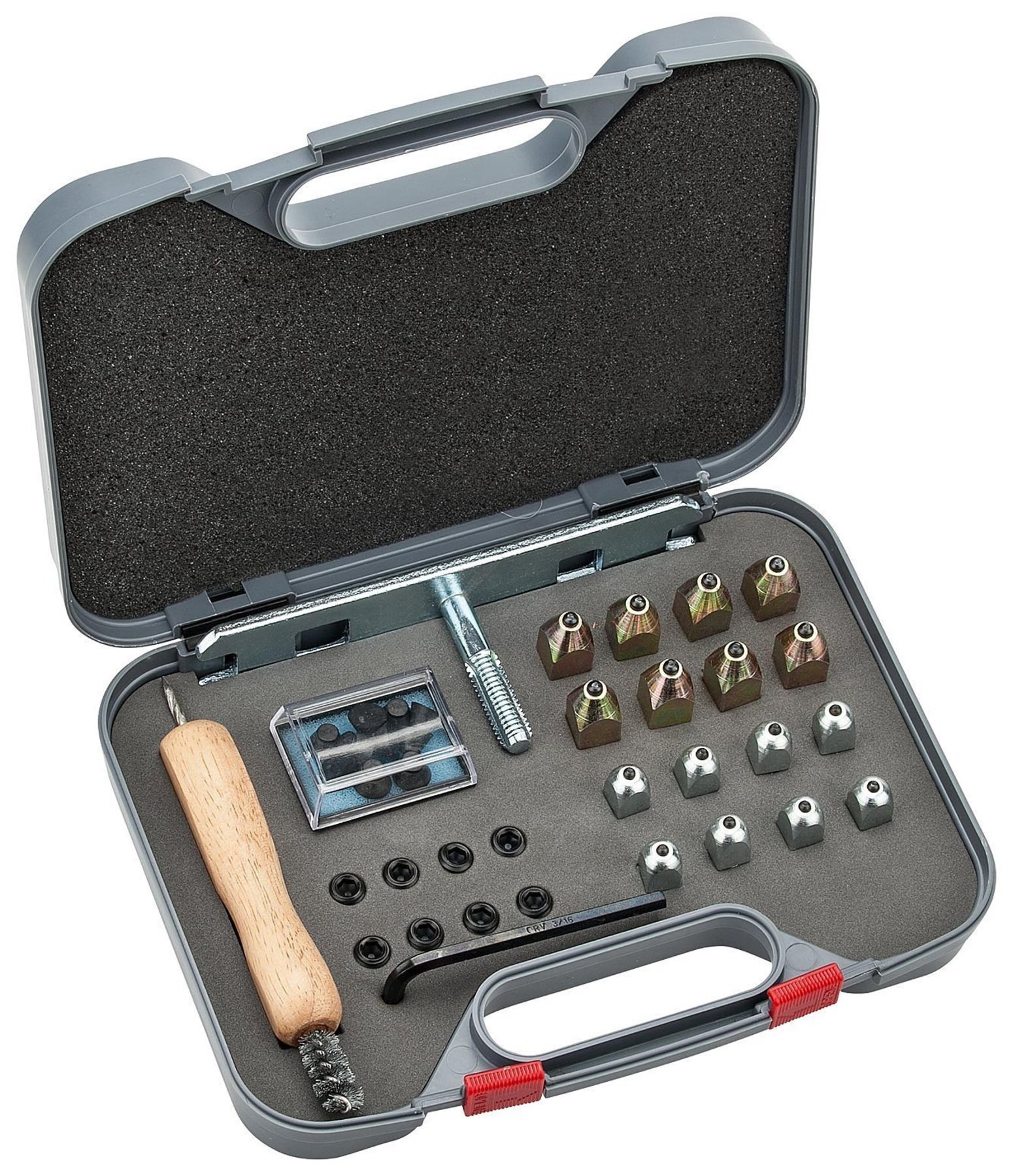 La mallette à crampons contient: 8 crampons pointus, 19 mm au-dessus du fer; 8 crampons arrondis, 12 mm au-dessus du fer; 8 bouchons protecteurs de filetage 10 x 150 à visser; 10 bouchons de mortaise en caoutchouc; 1 clé 6 pans; 1 clé en T 10 x 150; 1 brosse à mortaise.