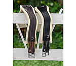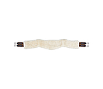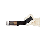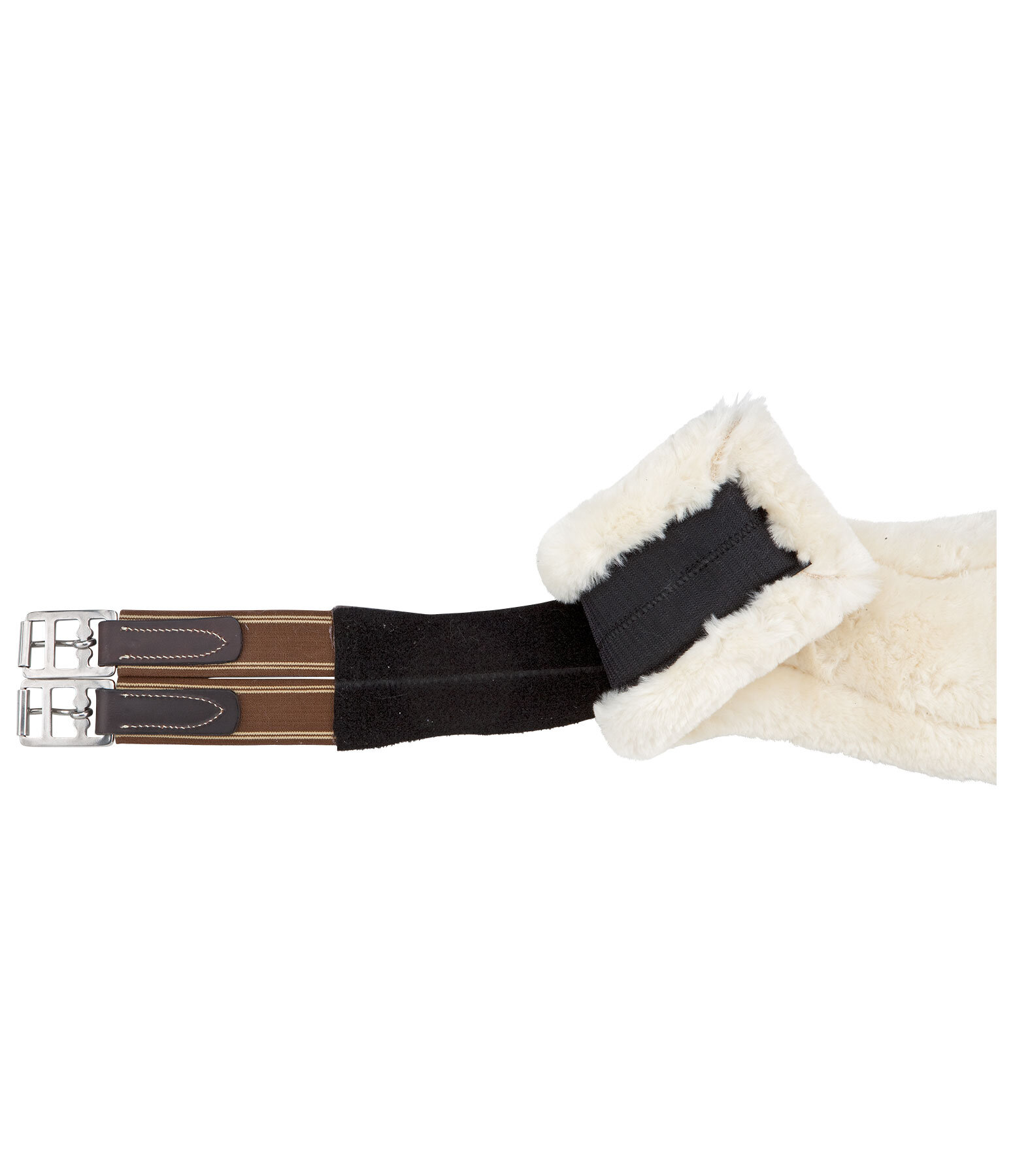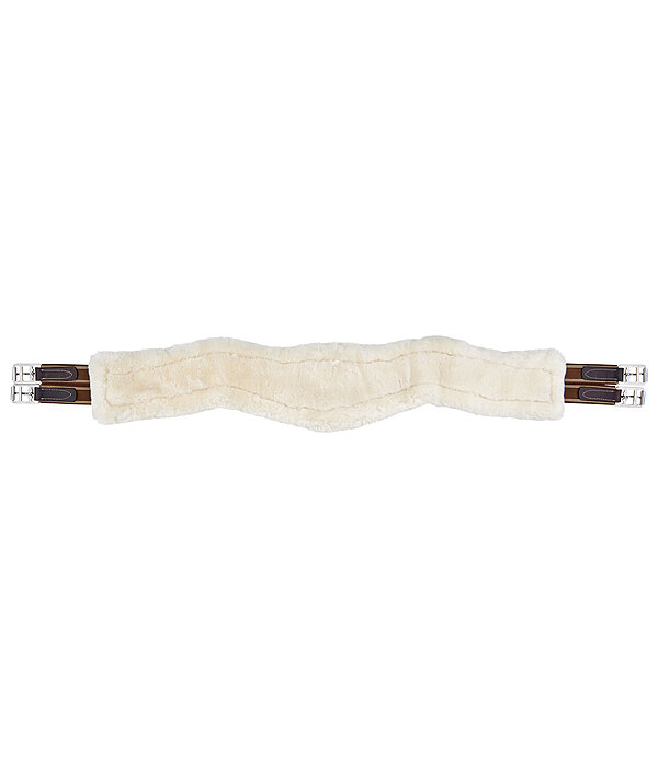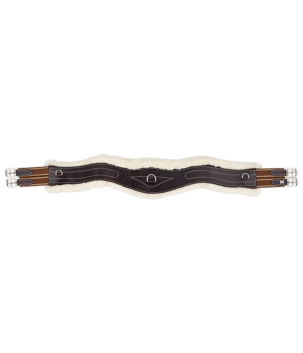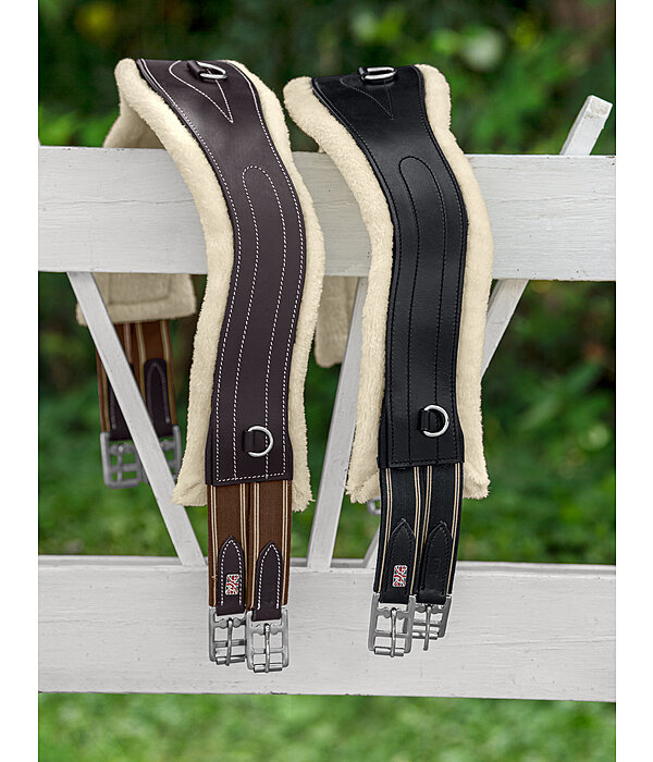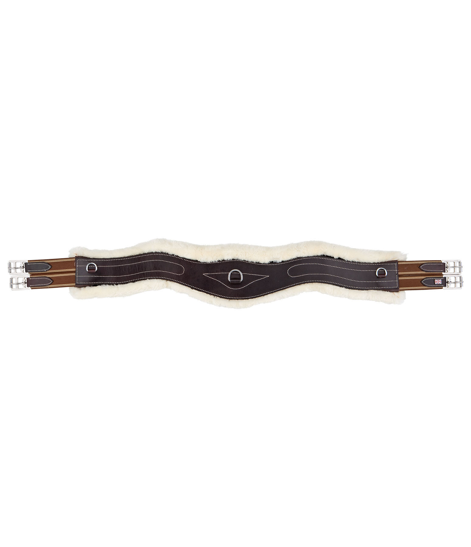 Sangle anatomique en cuir avec polaire Teddy amovible, trois anneaux en D, inserts élastiques de chaque côté et boucles à rouleau. Largeur de la sangle 11 cm, avec polaire Teddy 15 cm.