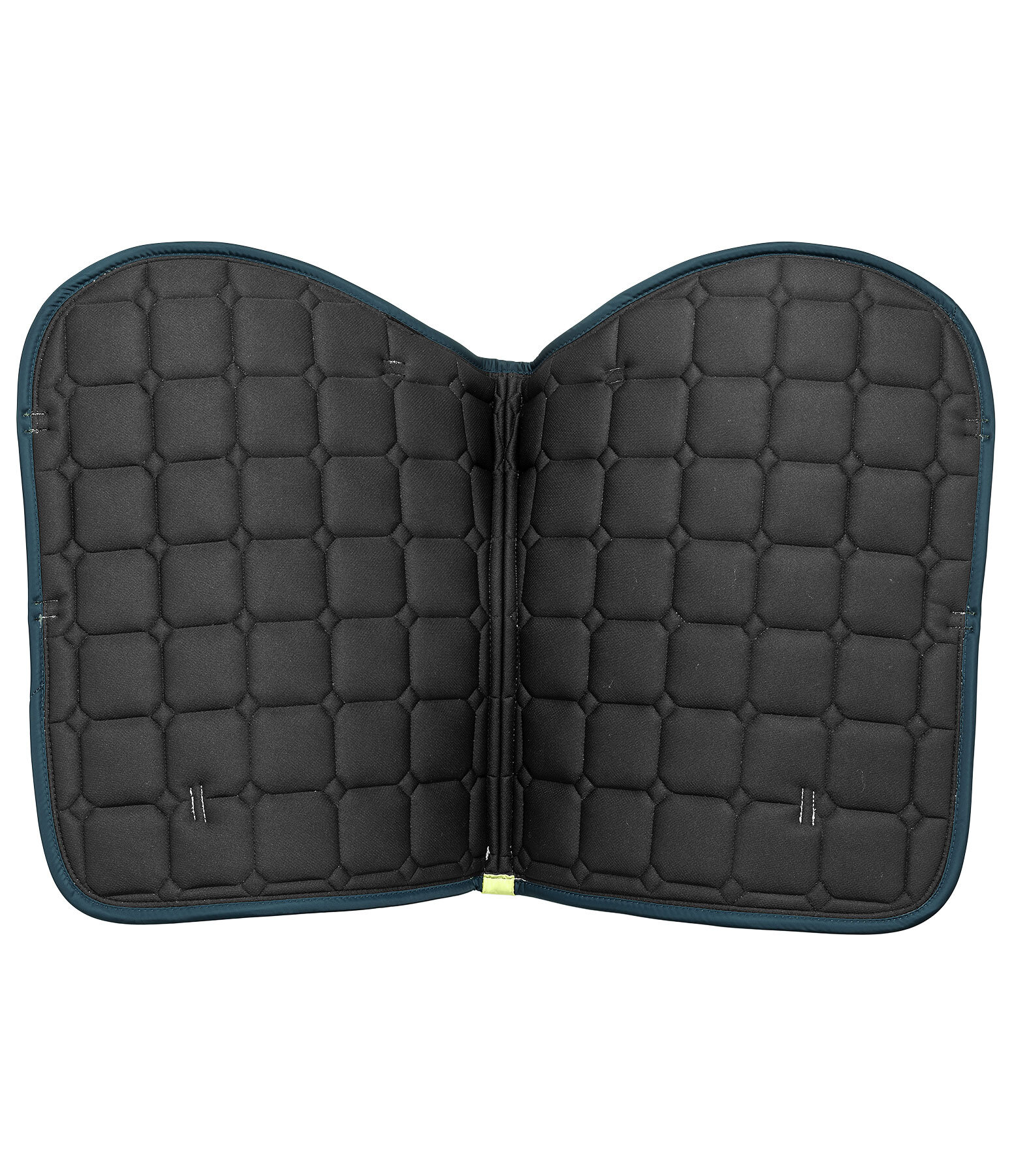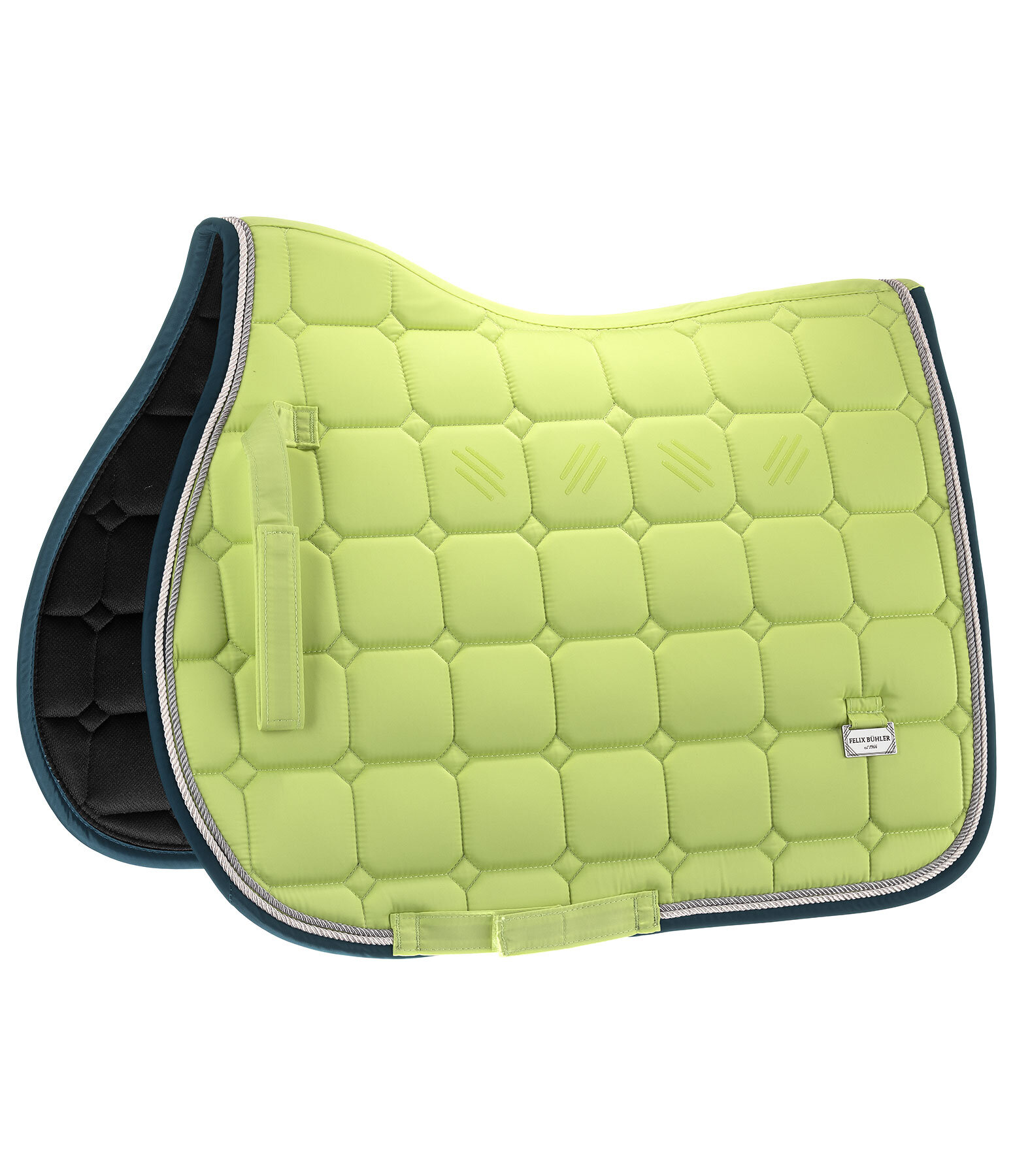 Tapis de selle élégant en tissu satiné et brillant avec grip en silicone dans la zone de la selle pour un maintien idéal. Détails élégants comme le double cordon décoratif et une plaque métallique de couleur assortie avec logo de chaque côté. Passants de sangle et de contre-sanglons avec patte auto-agrippante pratique. Doublure en mesh respirant et absorbant l'humidité. 100 % polyester.