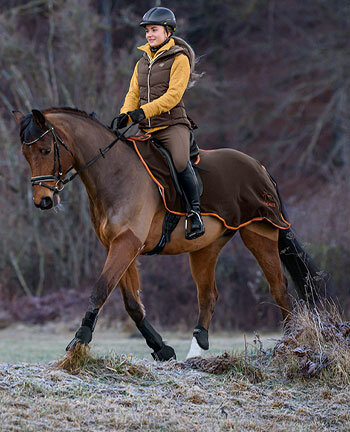 Pour les chevaux dont le dos est sensible au froid ou à l'humidité, il est recommandé d'utiliser un couvre-reins imperméable et coupe-vent. Celui-ci peut être fixé devant ou directement sur la selle à l'aide de pattes auto-agrippantes ou de boucles. Selon la température extérieure, on peut choisir un couvre-reins d'extérieur légèrement doublé ou non. En hiver, il est conseillé d'utiliser un couvre-reins imperméable avec un grammage 50 g au niveau des reins.