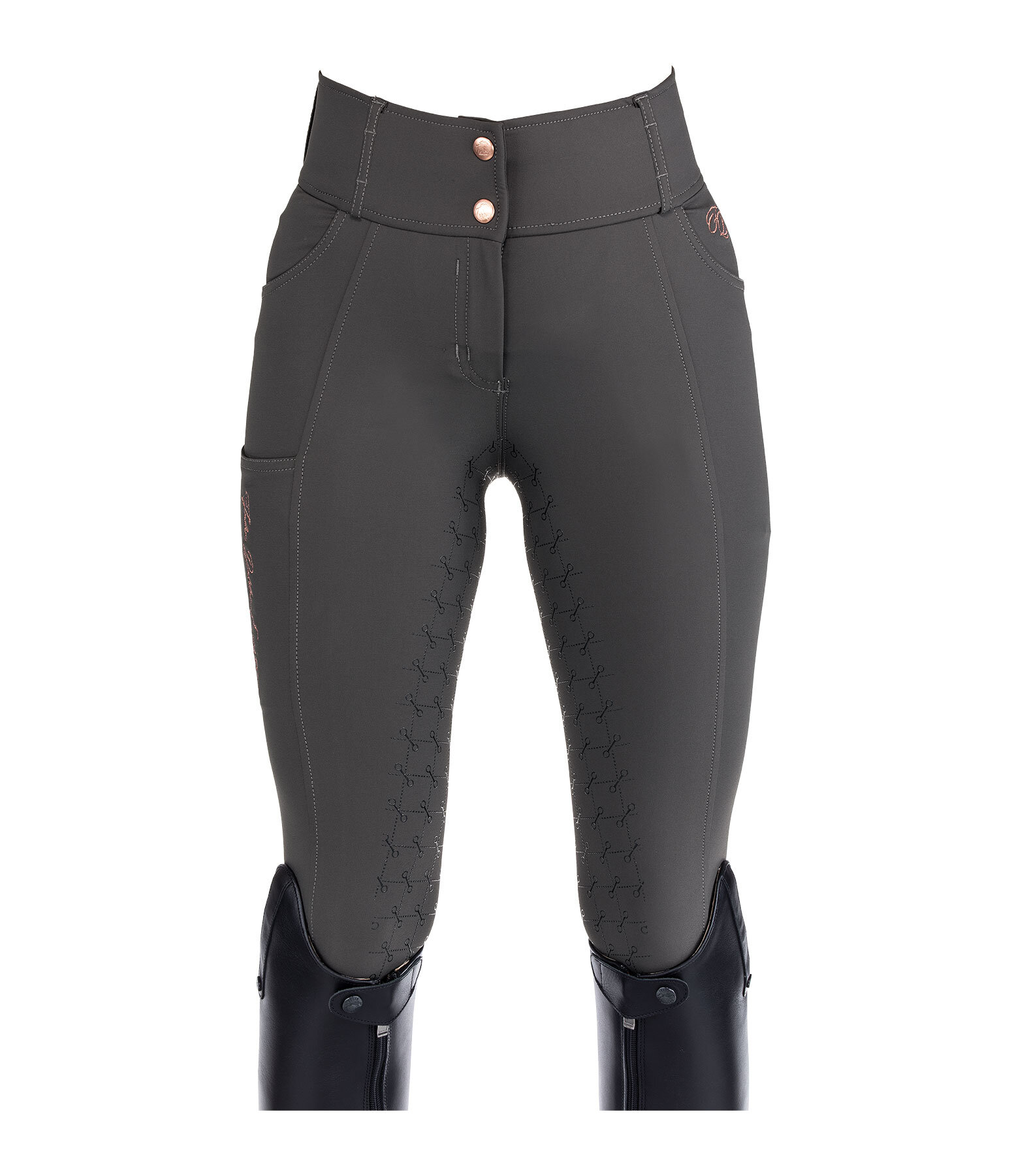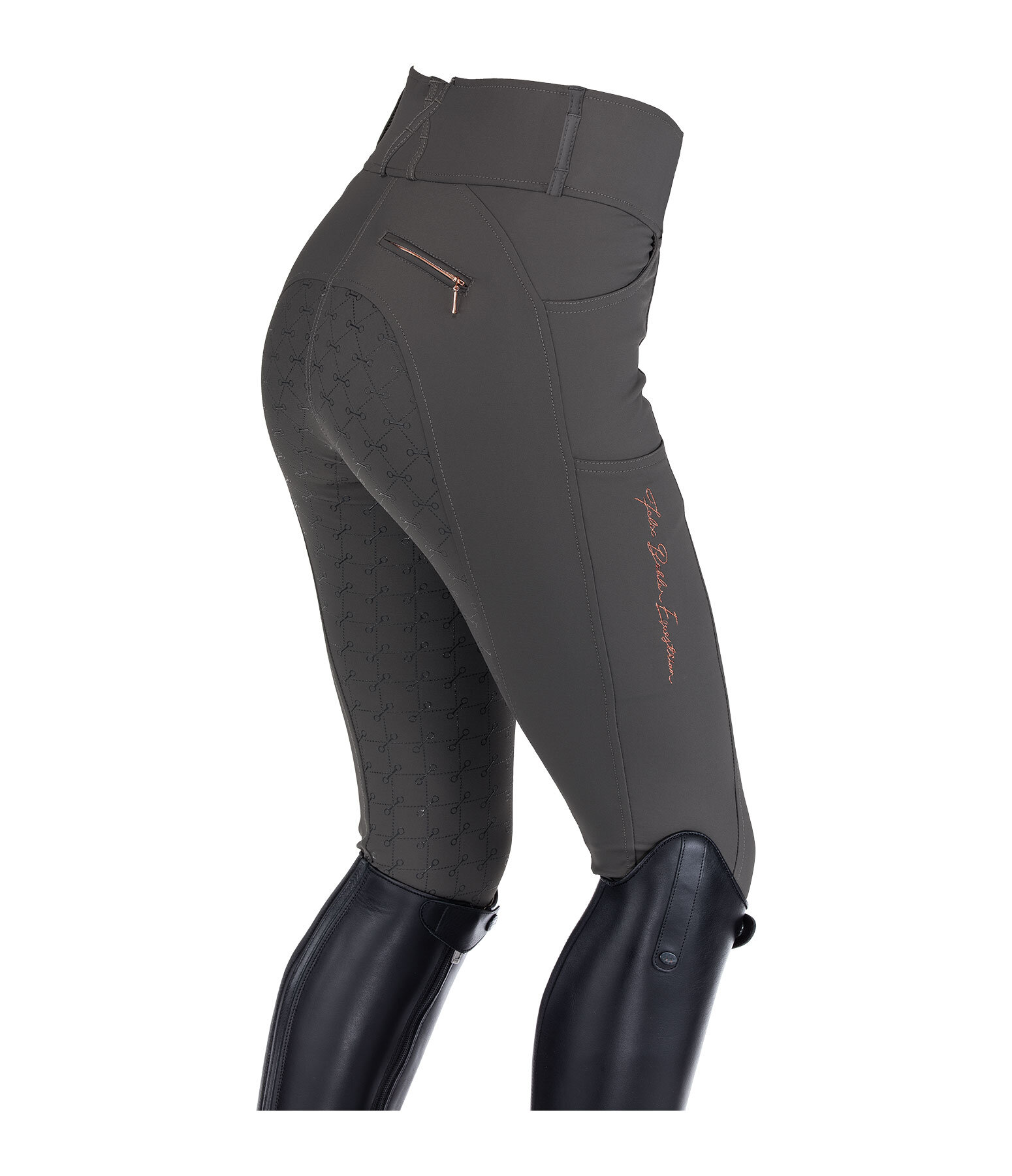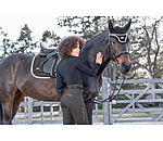 Pantalon d'équitation sportswear et extensible, à fond intégral grip en silicone avec motifs de mors. Matière déperlante, respirante et à séchage rapide. Broderie Felix Bühler sur la jambe. Poche arrière zippée et poche pour téléphone portable sur la cuisse. Deux poches avant. Ceinture à passants extra large élastiquée avec 2 boutons. Aucune couture aux genoux. Bas de jambe extensible en stretch. 89 % nylon, 11 % élasthanne.