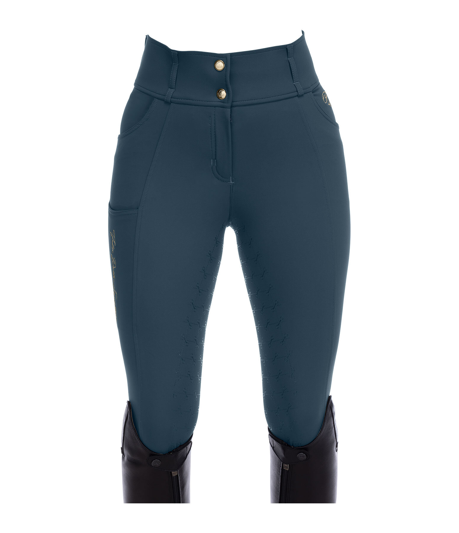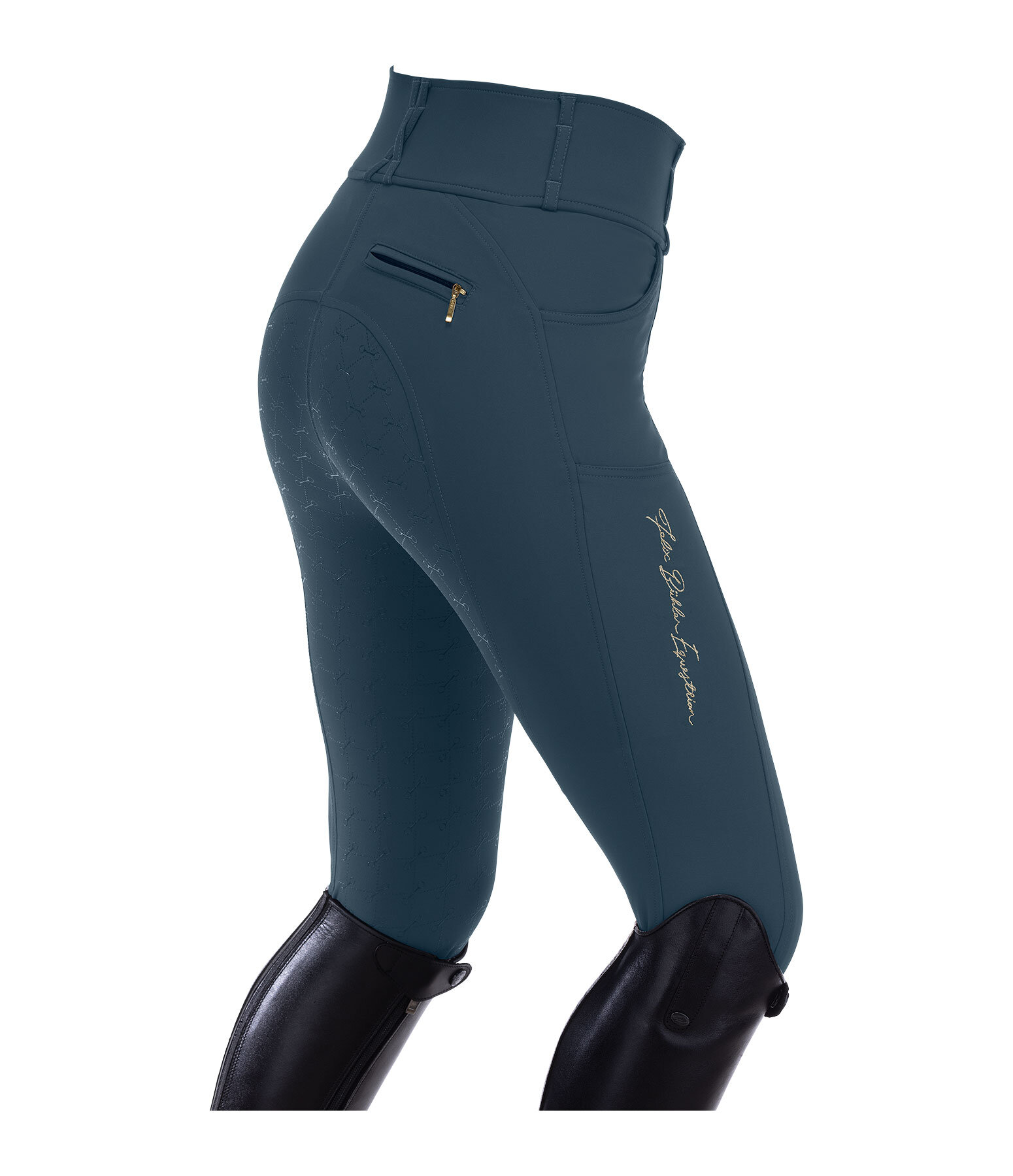 Pantalon d'équitation sportswear et extensible, à fond intégral grip en silicone avec motifs de mors. Matière déperlante, respirante et à séchage rapide. Broderie Felix Bühler sur la jambe. Poche arrière zippée et poche pour téléphone portable sur la cuisse. Deux poches avant. Ceinture à passants extra large élastiquée avec 2 boutons. Aucune couture aux genoux. Bas de jambe extensible en stretch. 89 % nylon, 11 % élasthanne.