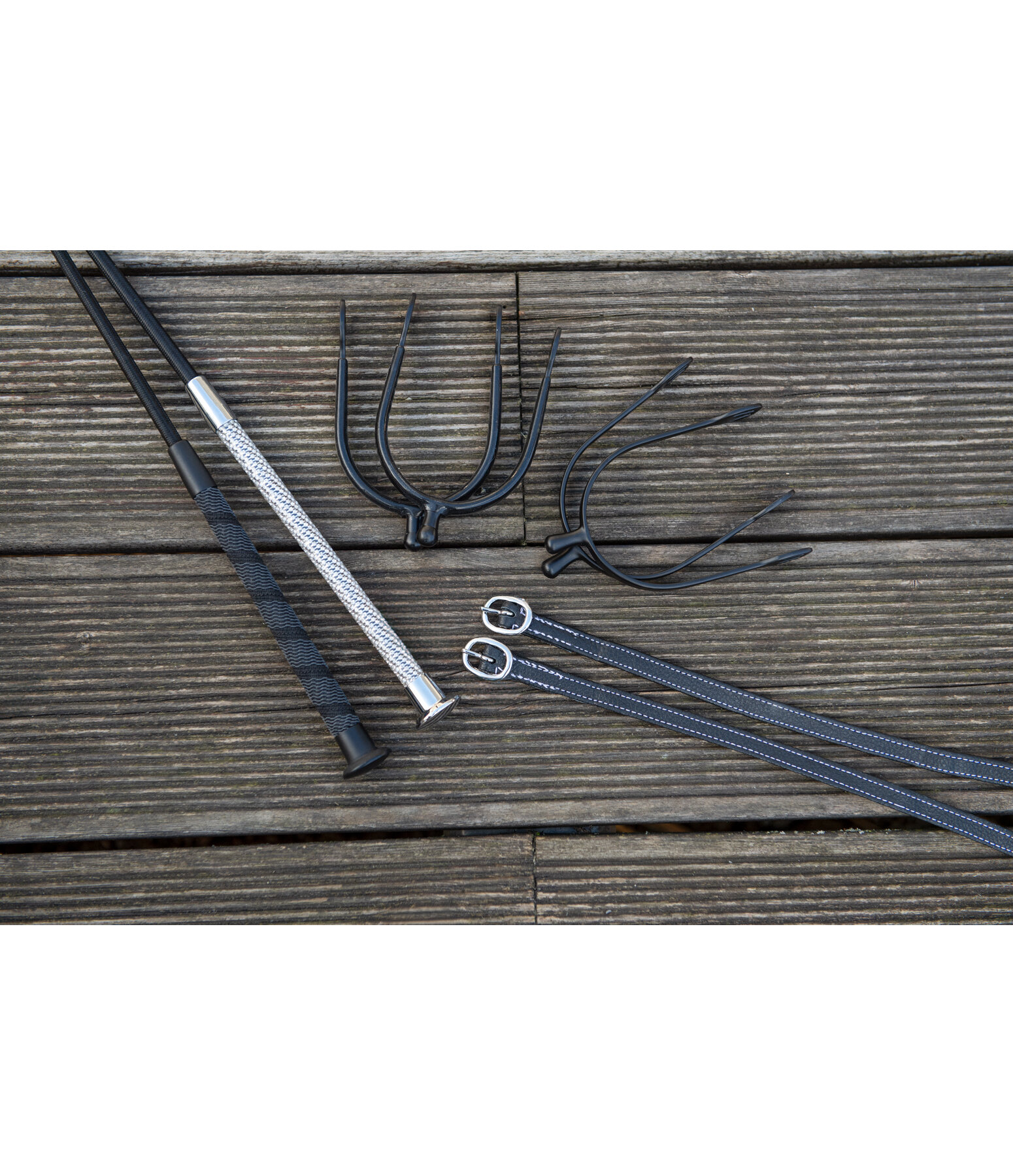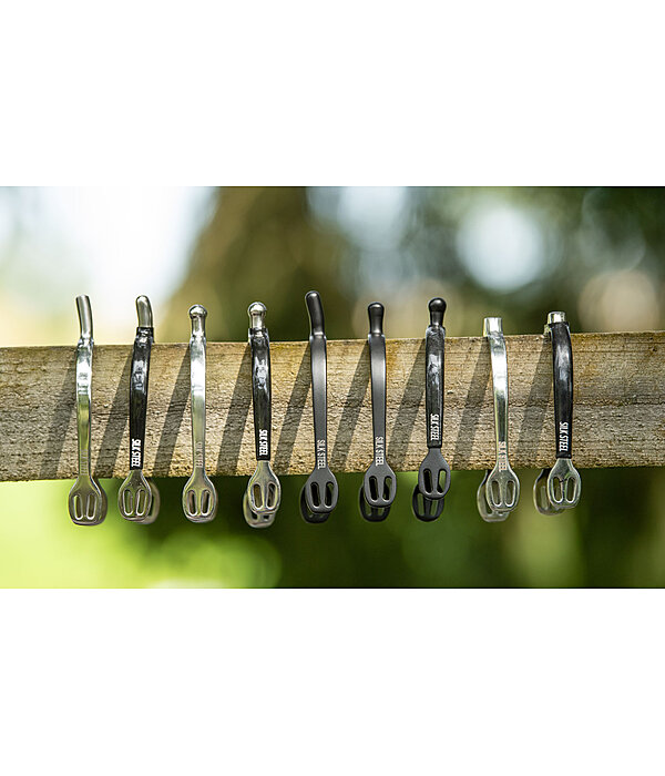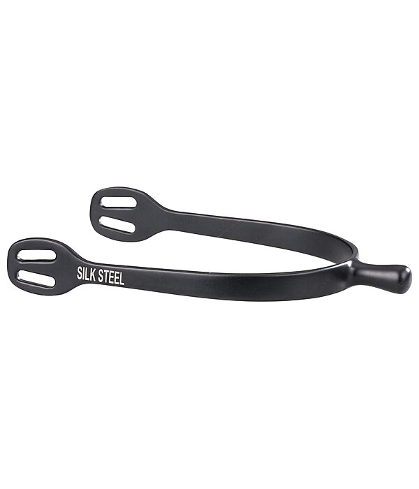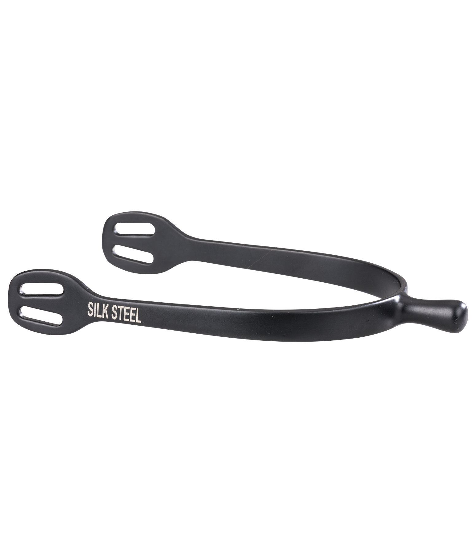 Éperons à bout rond en acier inoxydable noir mat avec logo SILK STEEL gravé. Forme améliorée des oeillets pour faciliter le passage des lanières. Longueur de tige 20 mm.