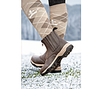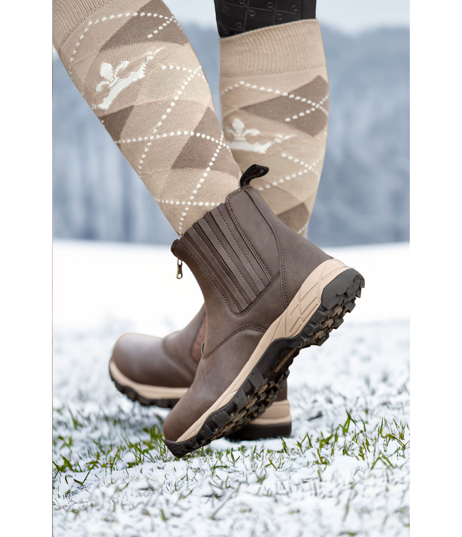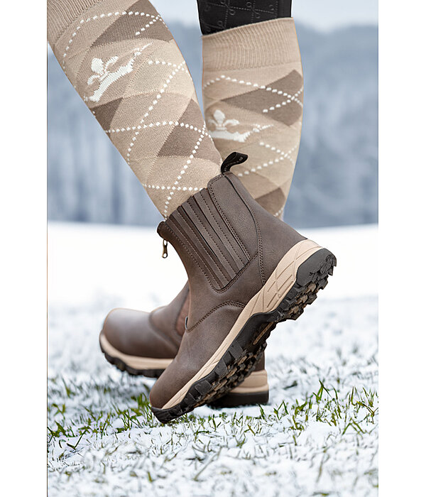 Bottines robustes doublées de polaire chaude (100 % polyester). Fermeture à glissière à l'avant. Soufflet élastiqué de chaque côté de la bottine et languette à l'arrière pour faciliter l'enfilage et le retrait. Assise plantaire confortable grâce à la semelle double épaisseur (semelle intermédiaire souple en EVA et semelle extérieure antidérapante en caoutchouc). Synthétique (PU).