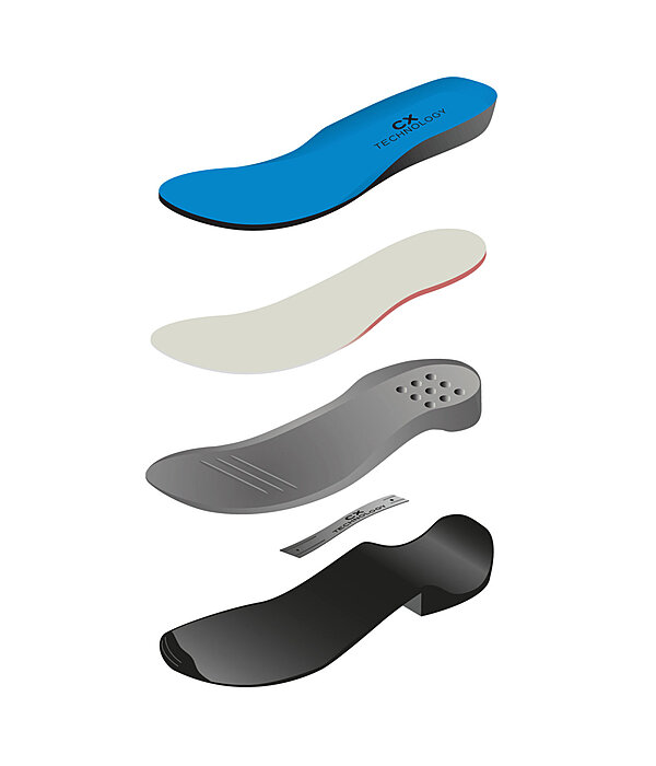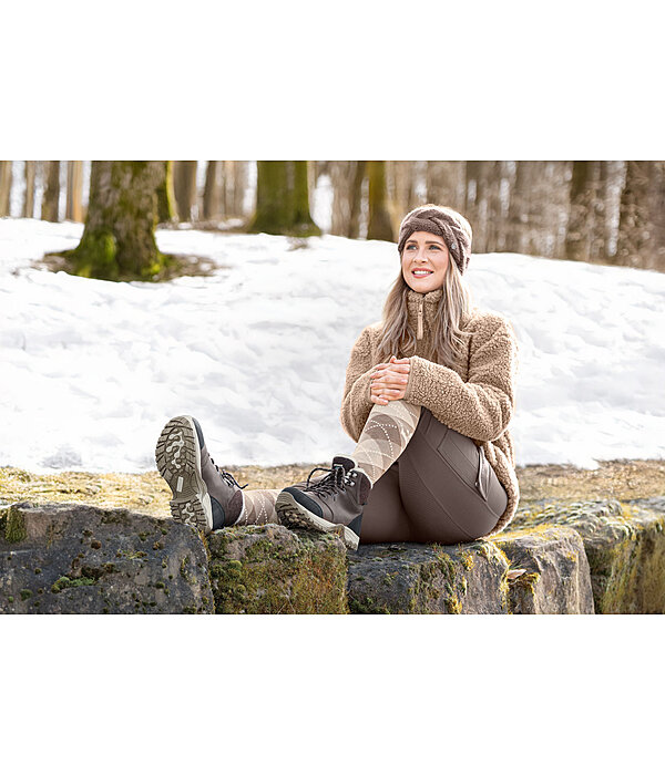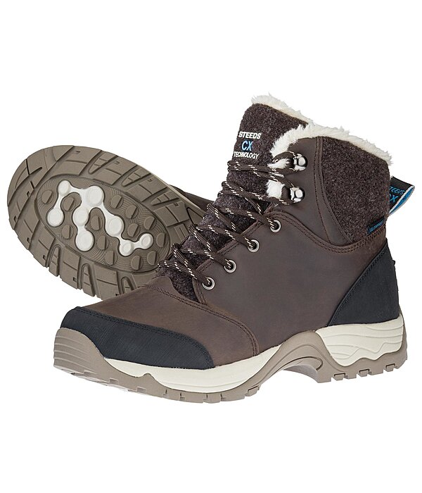 Chaussures d'hiver imperméables en cuir vachette gras pleine fleur de qualité exceptionnelle avec doublure intérieure en polaire Teddy (100 % polyester) conservant la chaleur. La membrane imperméable et la languette cousue empêchent la neige et l'eau de pénétrer dans la chaussure. La semelle intérieure CX Technology possède les meilleures propriétés d'amortissement et assure un confort maximal dans la durée pendant la pratique de l'équitation et la marche. Détails supplémentaires tels que le renfort au talon et aux orteils, le rembourrage doux en polaire aux chevilles, le laçage rapide avec crochets, le taquet d'éperon et la bande réfléchissante à l'arrière.