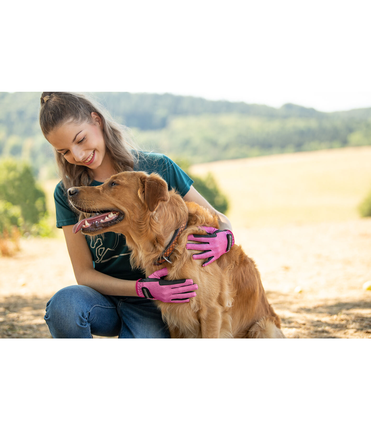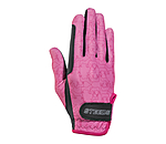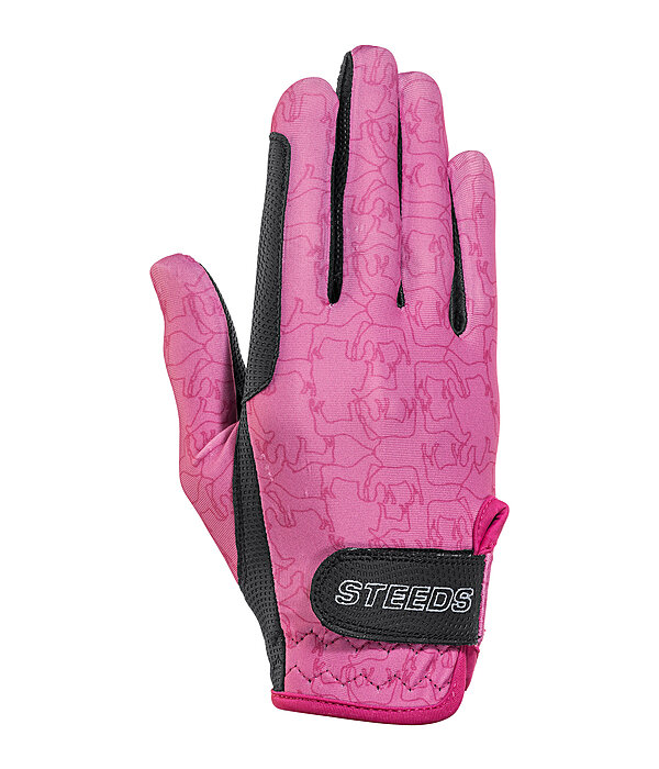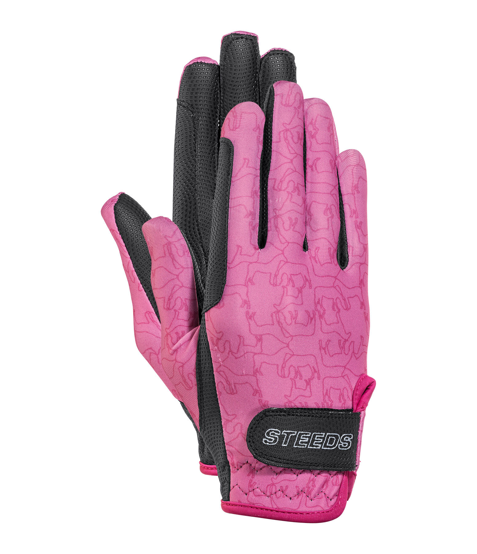 Gants d'équitation d'été légers et extensibles. Joli motif all-over cheval. Dos de la main en nylon doux. Paume en PU antidérapant. Renfort sur l'index pour éviter les irritations dues aux frottements. Fermeture par patte auto-agrippante avec logo STEEDS pour un ajustement optimal. Dessus : 82 % nylon, 18 % élasthanne. Paume: 51 % nylon, 49 % polyuréthane.