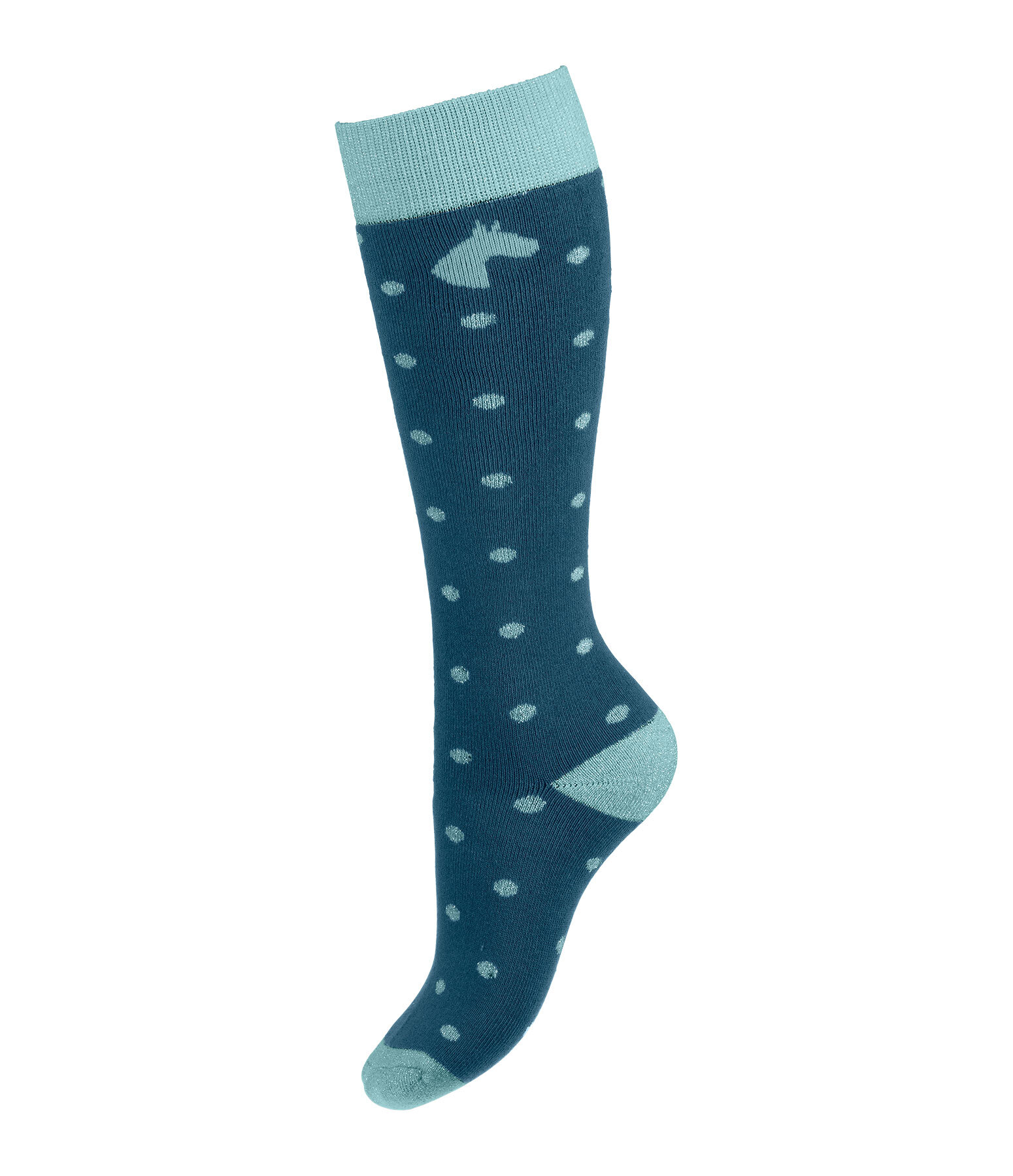 Chaussettes hautes d'équitation à pois scintillants et motif cheval. 80 % coton, 17 % polyester, 2 % nylon, 1 % élasthanne.