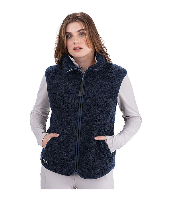 Gilet en polaire Teddy douce et extensible. Col montant. Coupe plus longue à l'arrière. Fermeture à glissière double sens avec sous-patte. Deux poches zippées latérales dissimulées. Étiquette STEEDS à la taille. 100 % polyester.