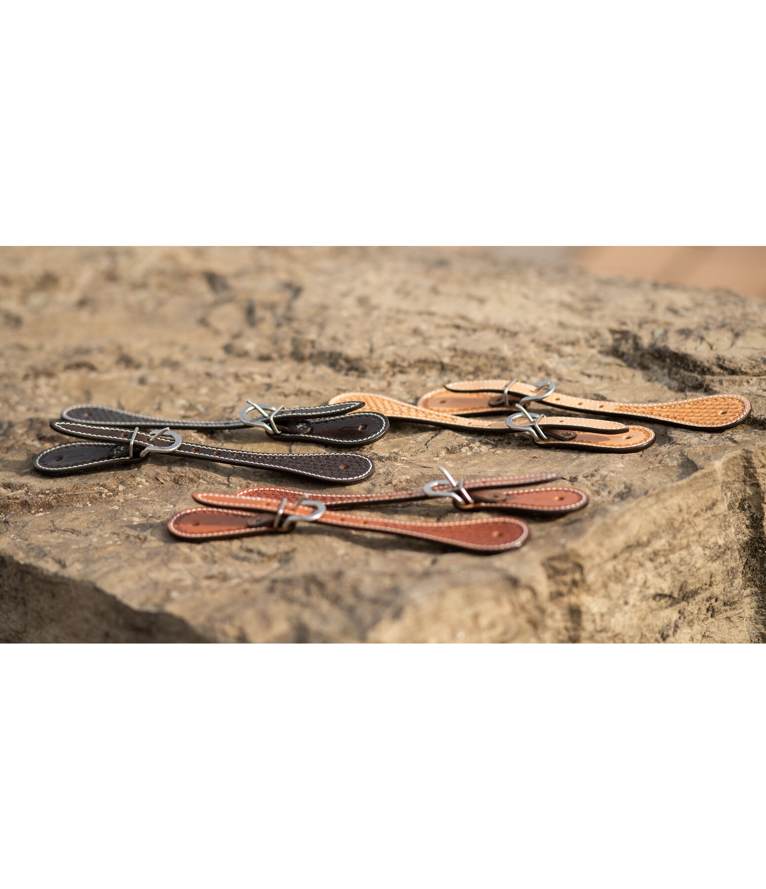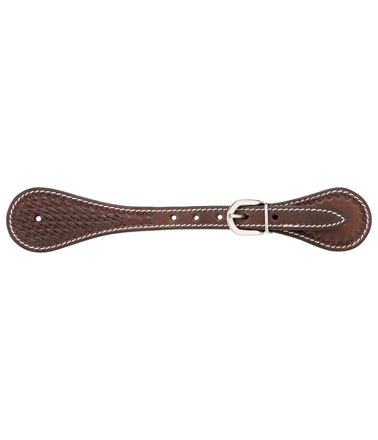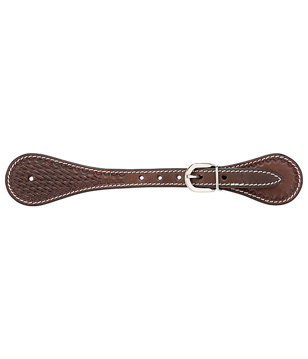 Lanière d'éperons en cuir véritable avec motifs en repoussage de cuir. Bouclerie en acier inoxydable.