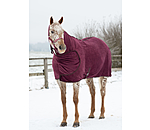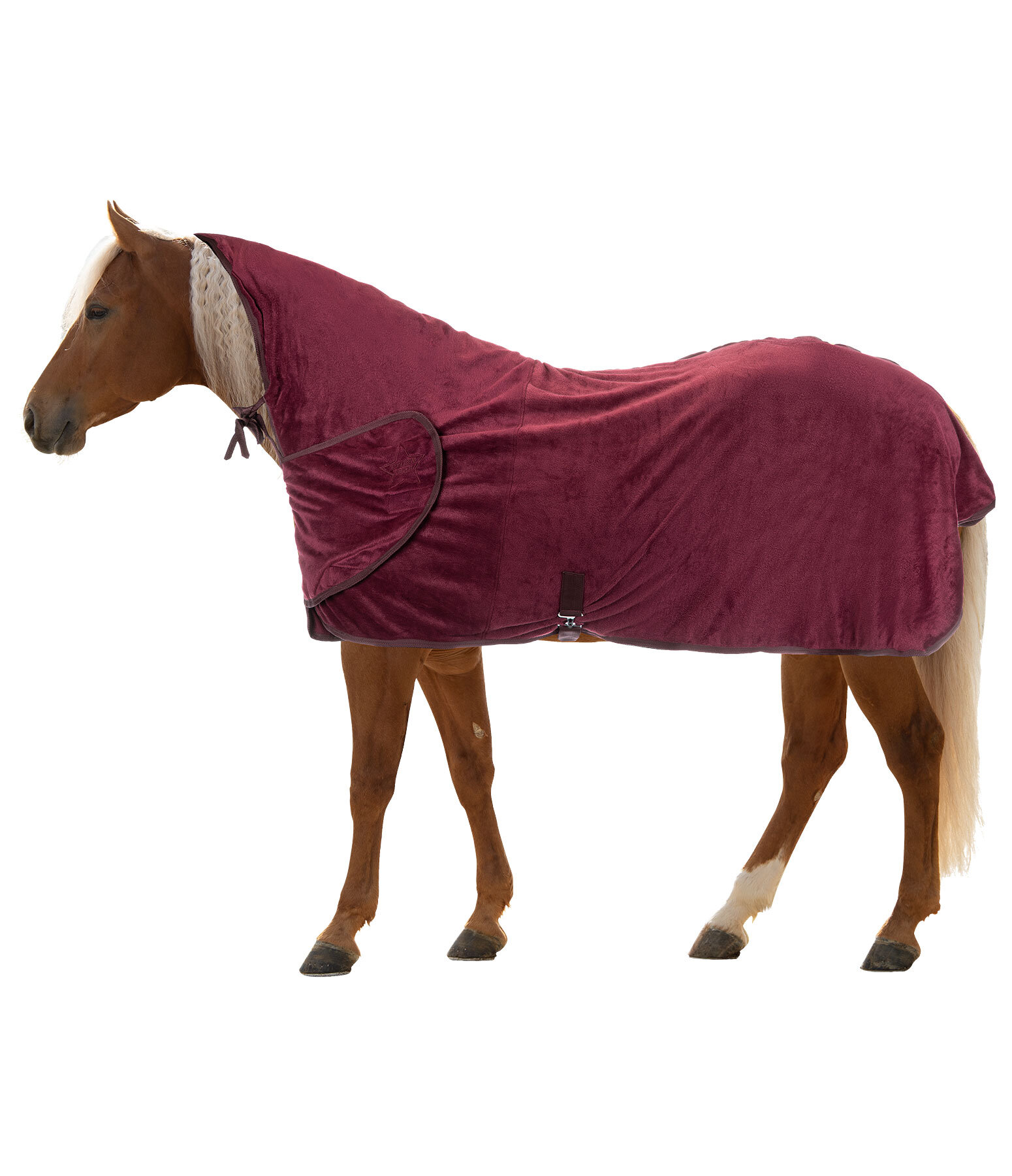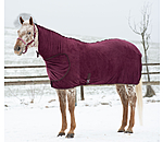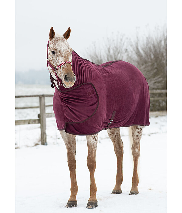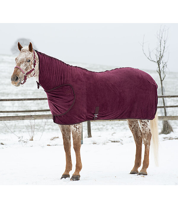 Chemise séchante douillette avec couvre-cou généreux. Sangle ventrale, courroie de queue, patte auto-agrippante au poitrail et patte auto-agrippante élastiquée pour fixer le couvre-cou au licol afin d'éviter qu'il ne glisse. 100 % polyester