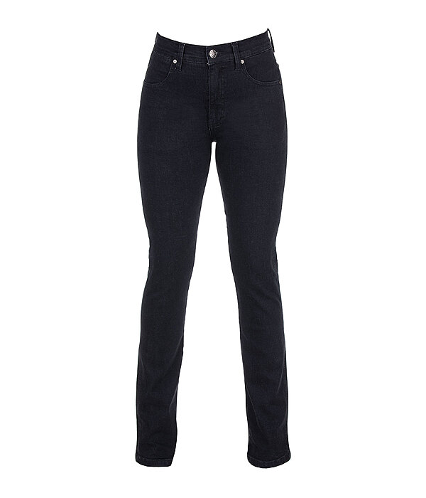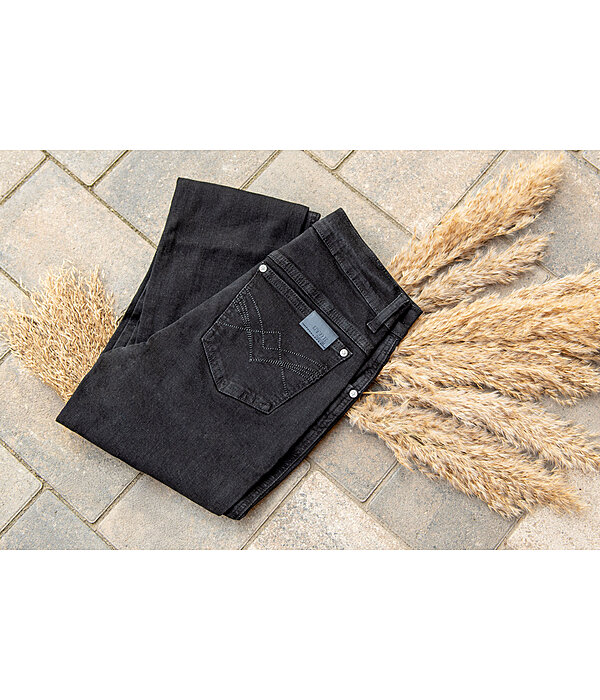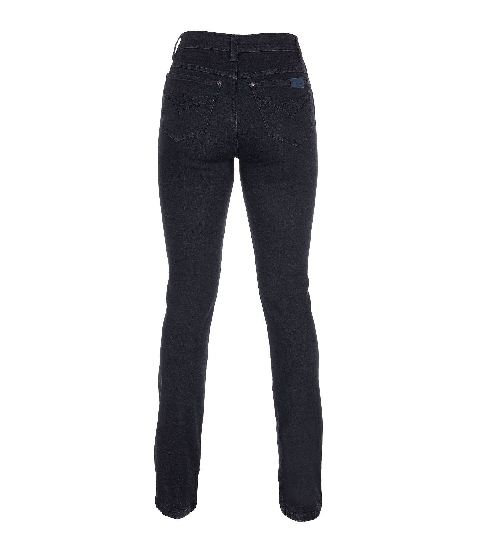 Jeans western noir confortable. Coupe droite. Taille mi-haute. Idéal pour être porté sur une paire de bottes. La teneur en stretch assure un confort optimal. Surpiqûres décoratives sobres sur les poches arrière. 98 % coton, 2 % élasthanne.