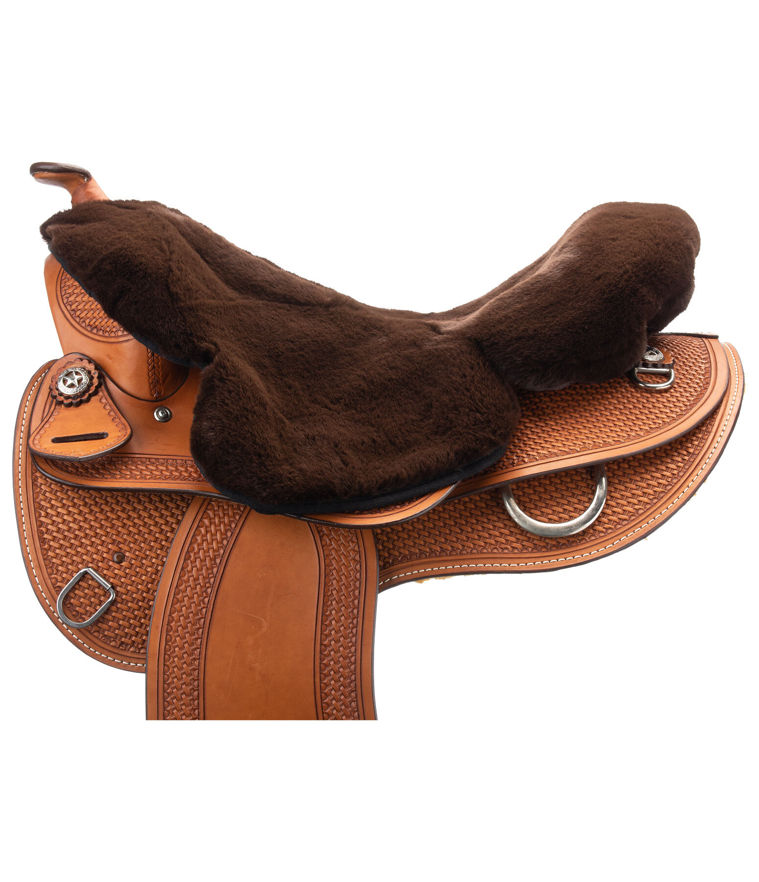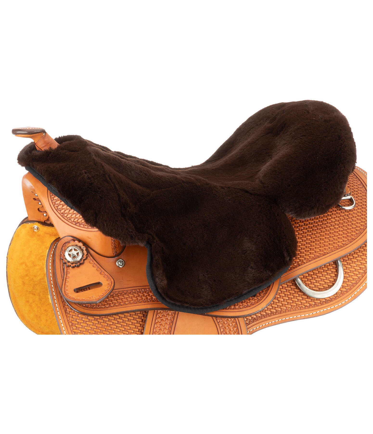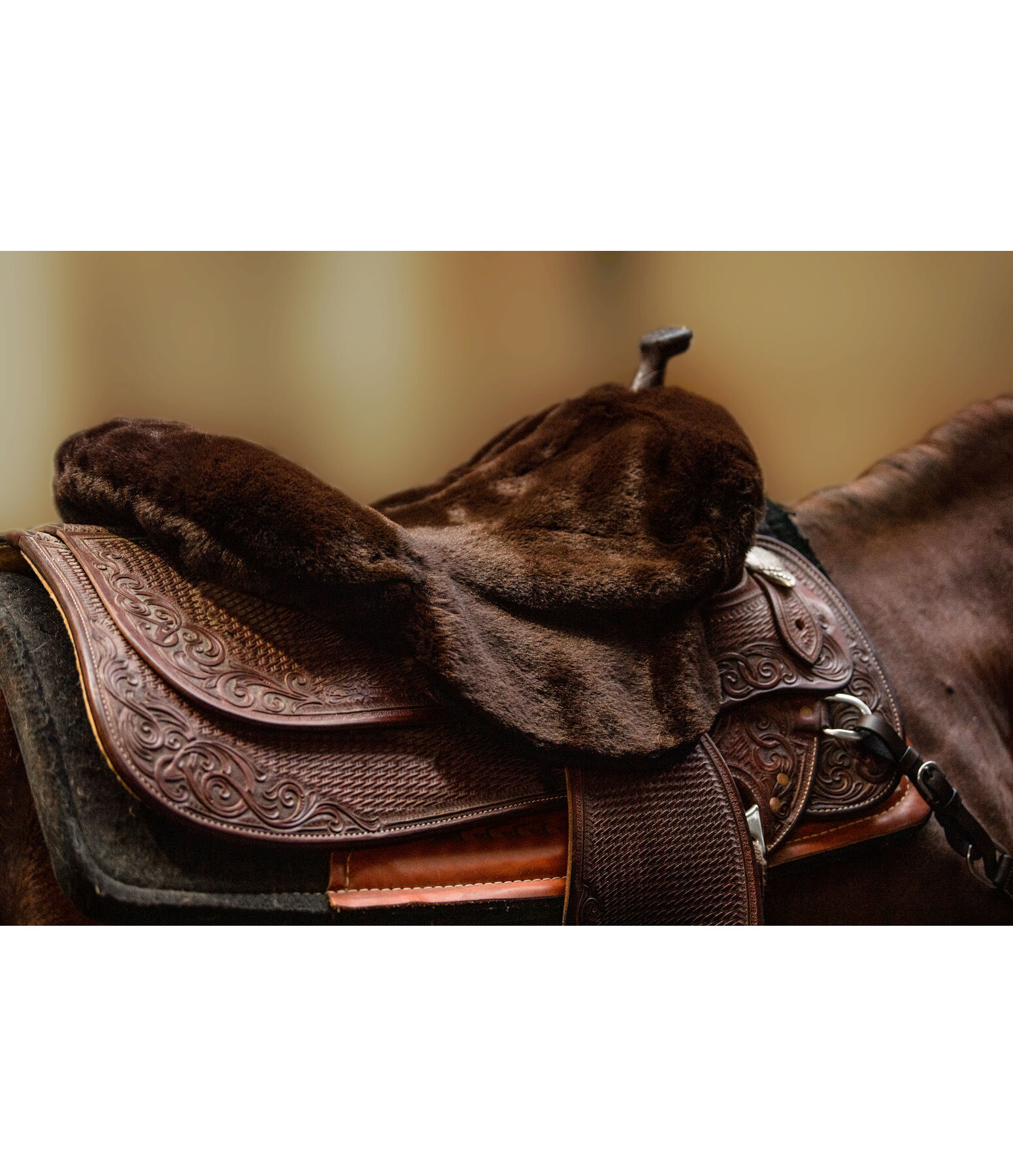 Couvre-siège western en imitation fourrure. Ressemble à de la fourrure d'agneau, mais 100 % vegan. Pour selles western de 14 "à 16". Avec découpe pour la corne de selle, cordons de fixation et élastique dans la zone du troussequin pour un ajustement idéal. 100 % polyester.