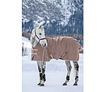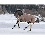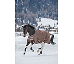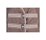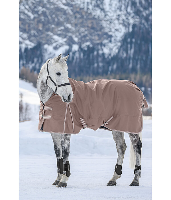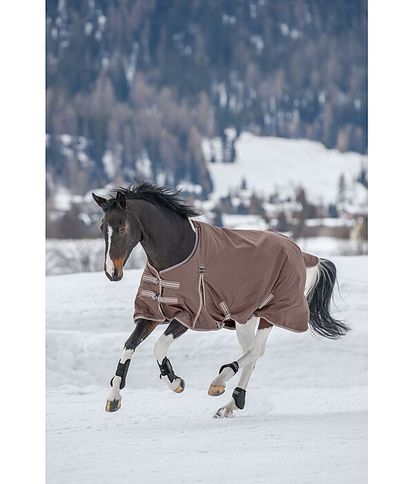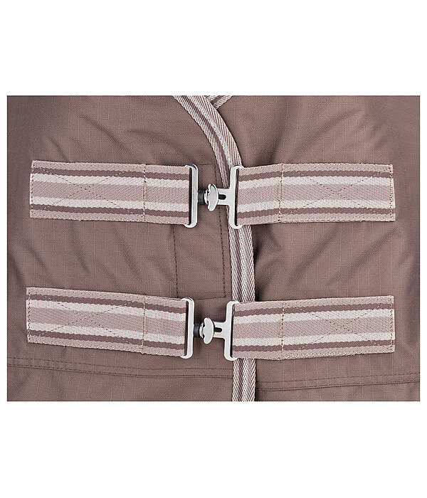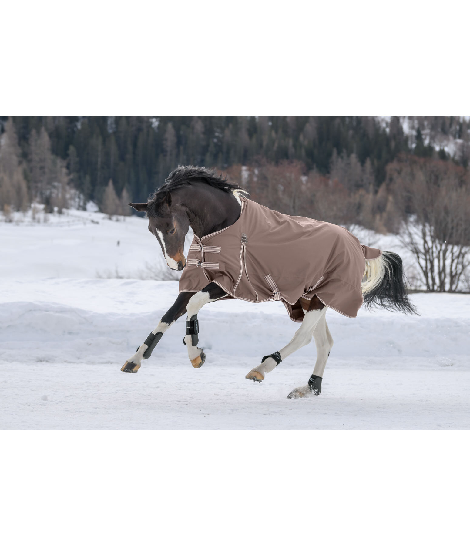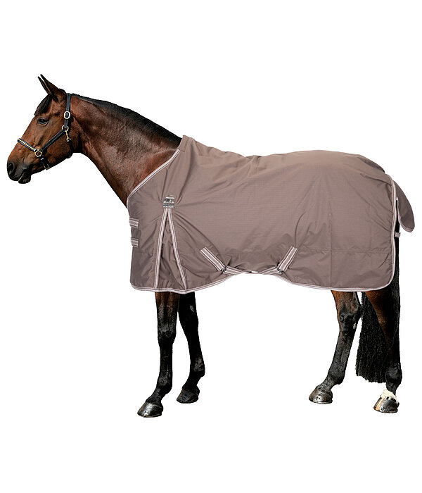 Couverture d'extérieur classique. Imperméable (3.000 mm). En matière Ripstop résistante 600 deniers avec garnissage 100g. Avec plis d'aisance pour une liberté de mouvement optimale, double fermeture de poitrail avec crochets en T et patte auto-agrippante supplémentaire, sursangles croisées réglables et rabat de queue. Anneaux permettant la fixation de courroies de cuisses (non incluses), courroie de queue réglable incluse. Pad de garrot permettant d'éviter les pressions et irritations dues aux frottements. Doublure lisse protégeant la robe. 100 % polyester.
