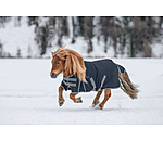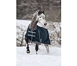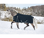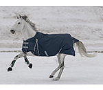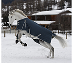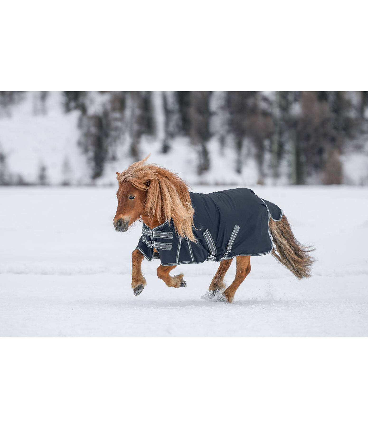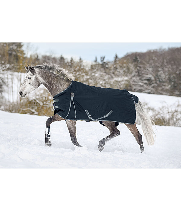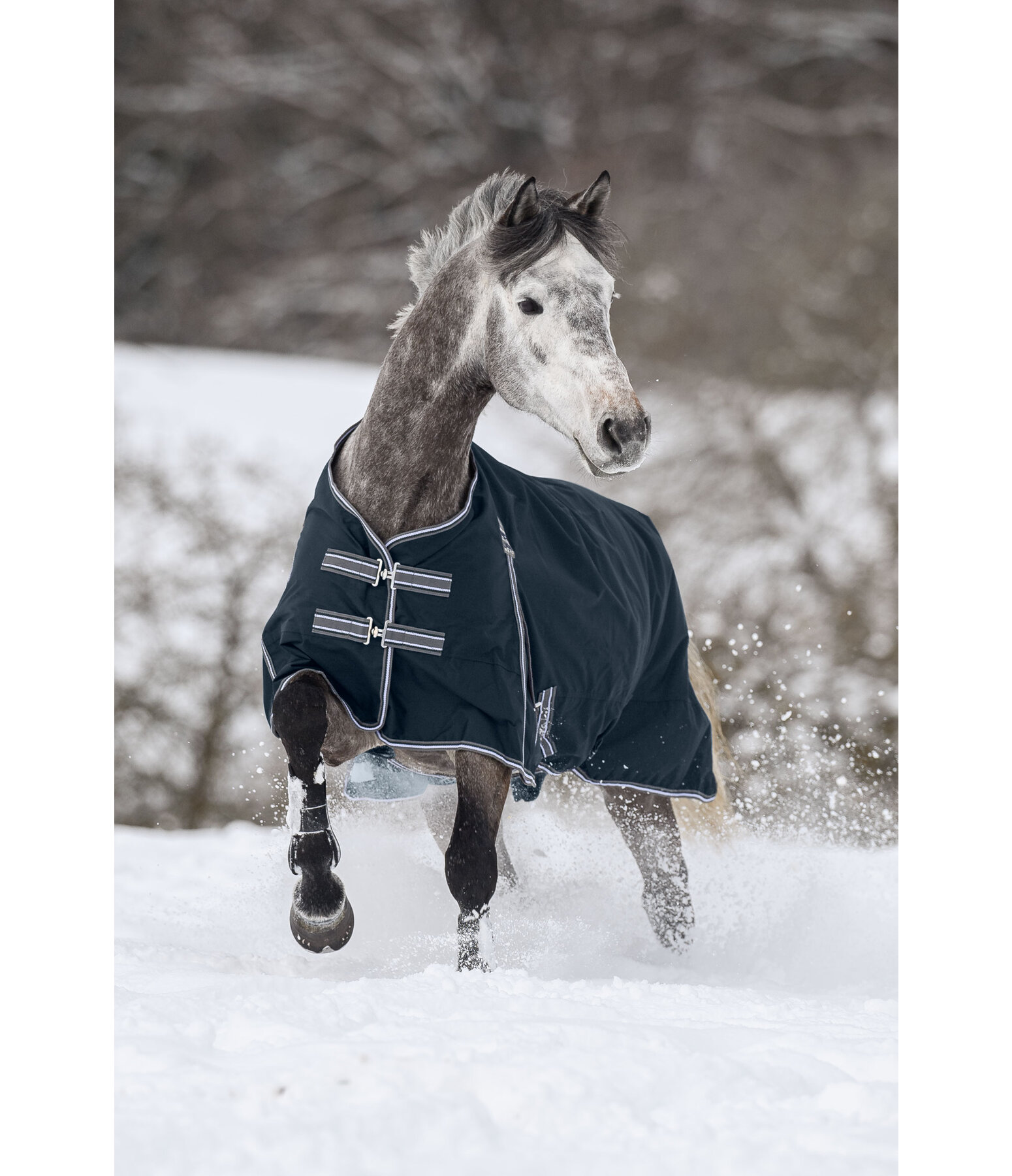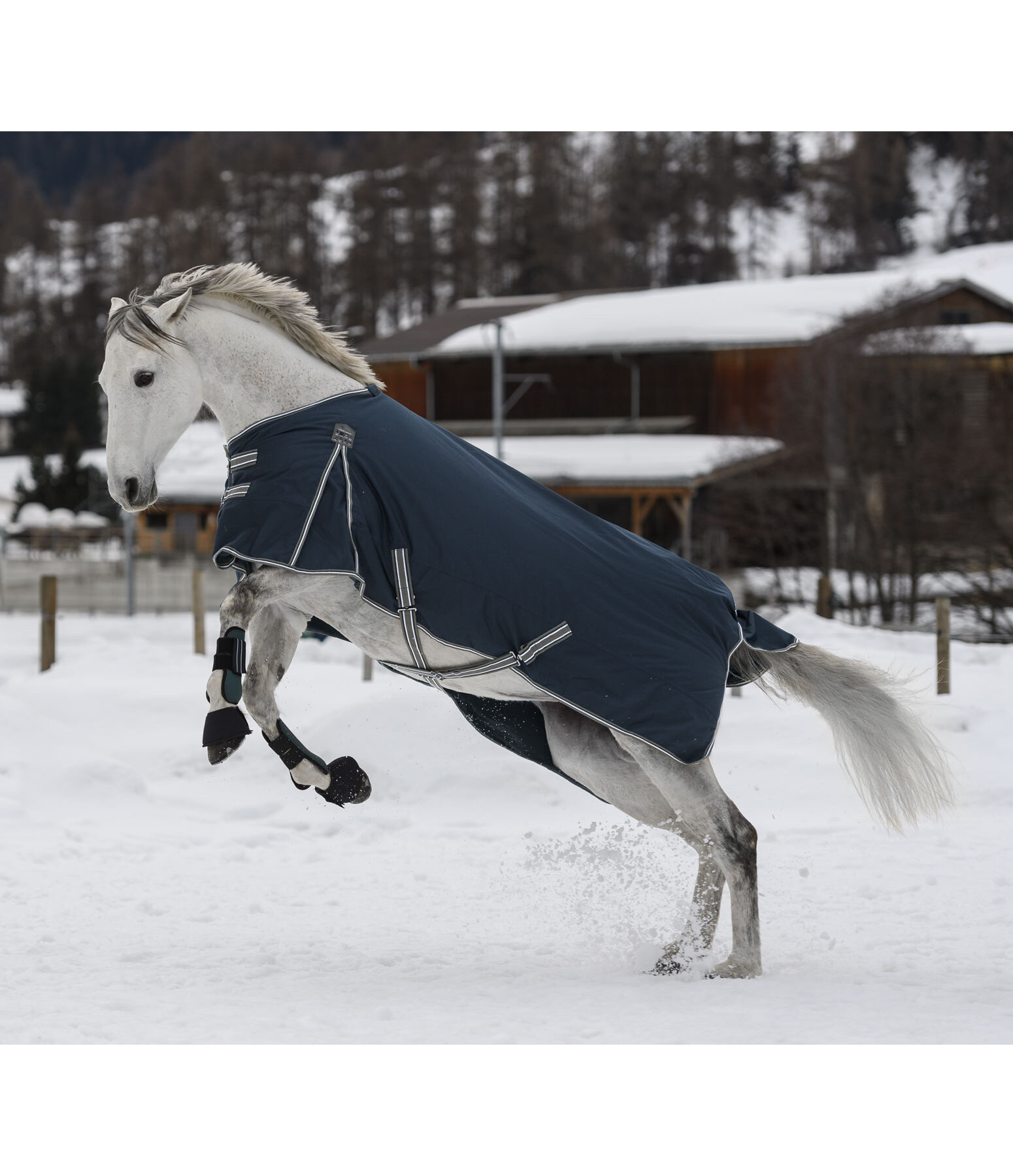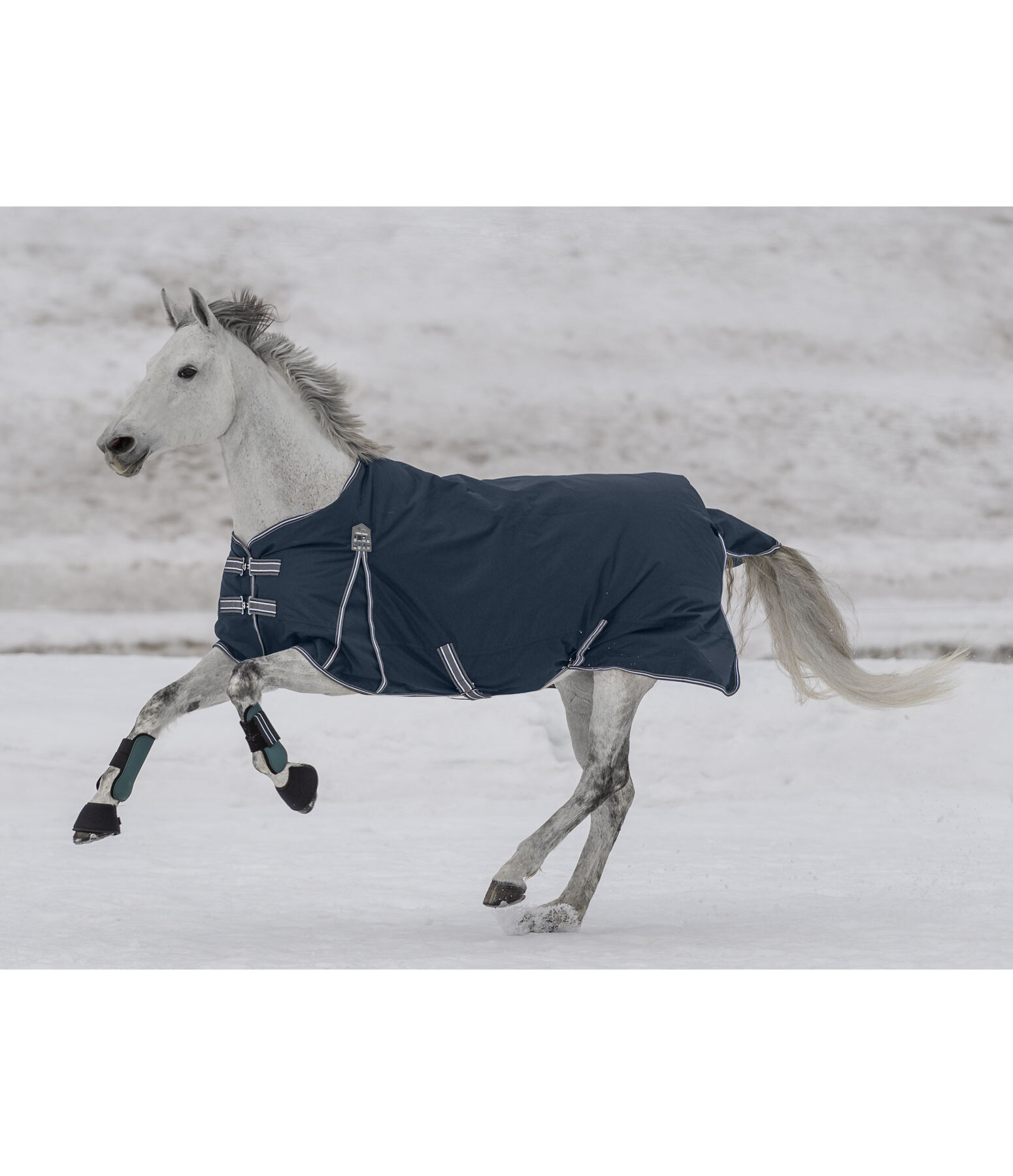 Couverture d'extérieur classique. Imperméable (3.000 mm). En matière Ripstop résistante 600 deniers avec garnissage 100g. Avec plis d'aisance pour une liberté de mouvement optimale, double fermeture de poitrail avec crochets en T et patte auto-agrippante supplémentaire, sursangles croisées réglables et rabat de queue. Anneaux permettant la fixation de courroies de cuisses (non incluses), courroie de queue réglable incluse. Pad de garrot permettant d'éviter les pressions et irritations dues aux frottements. Doublure lisse protégeant la robe. 100 % polyester.