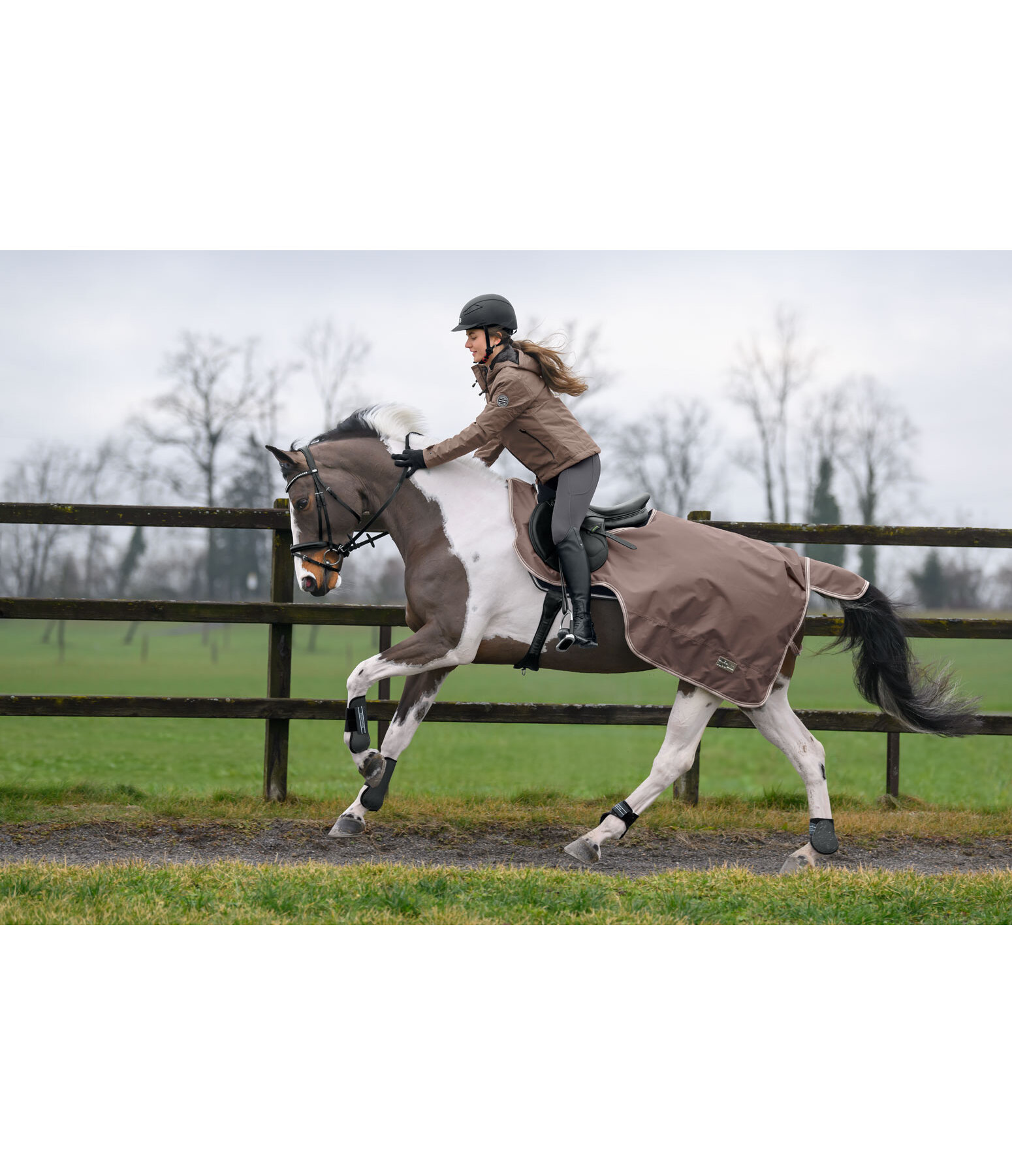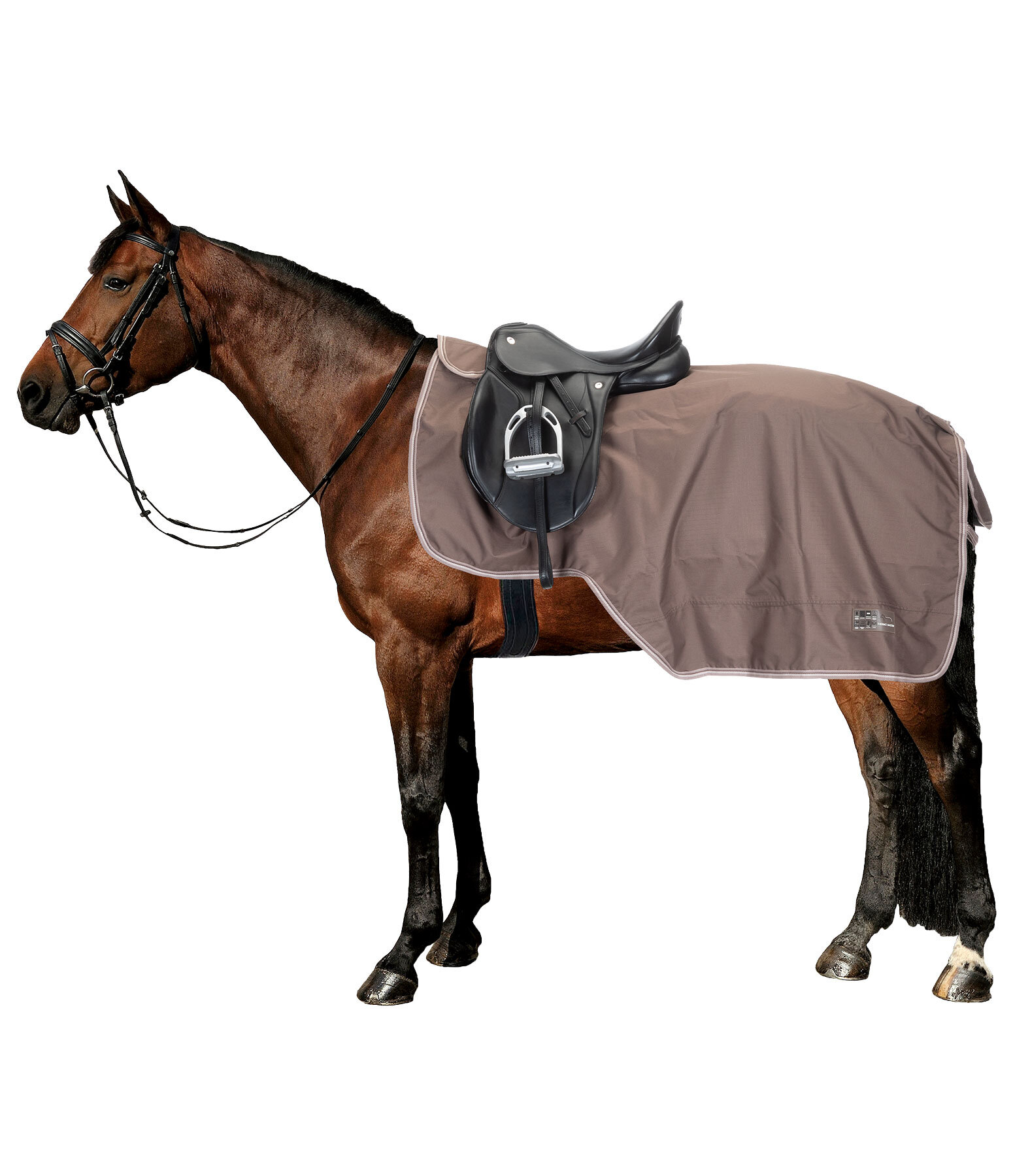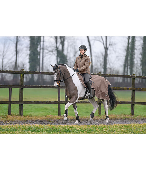 Couvre-reins imperméable (3.000 mm) et coupe-vent, en matière Ripstop 600 deniers, avec garnissage léger 50 g dans la zone des reins. Protège efficacement les reins et les flancs. Avec découpe pour selle anglaise. Large patte auto-agrippante au niveau du garrot pour une mise en place facile. Rabat de queue et courroie de queue réglable inclus. 100 % polyester.