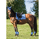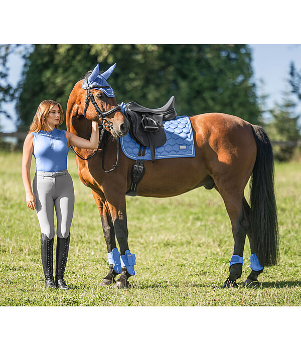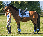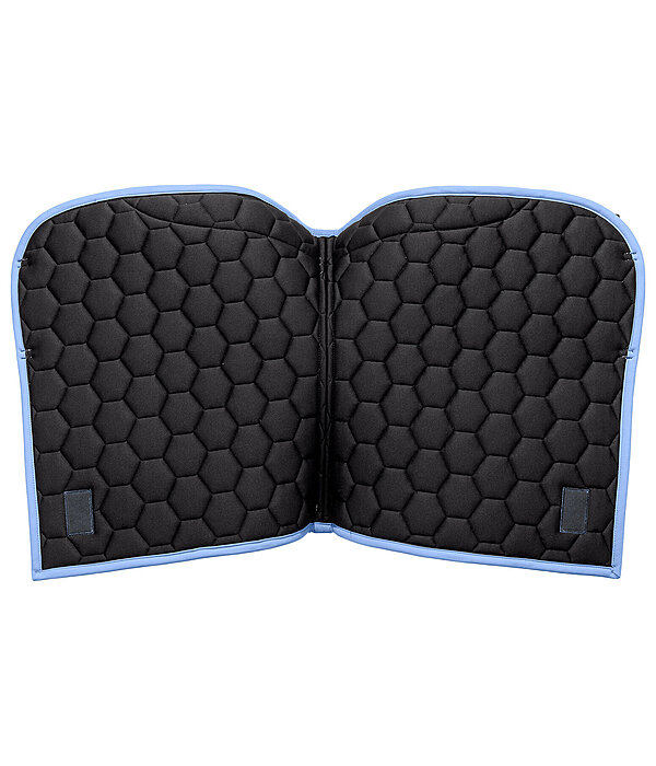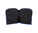 Tapis de selle avec rembourrage à l'avant permettant de garder la selle en place sans passants de contre-sanglons. Coupe sportive avec angle droit et surpiqûre en losanges. Dessus en matière lisse anti-salissures, cordon décoratif de couleur assortie et plaque logo métallique classique. Passants de sangle avec patte auto-agrippante pratique. Dessous en Air mesh respirant et absorbant l'humidité. 100 % polyester.