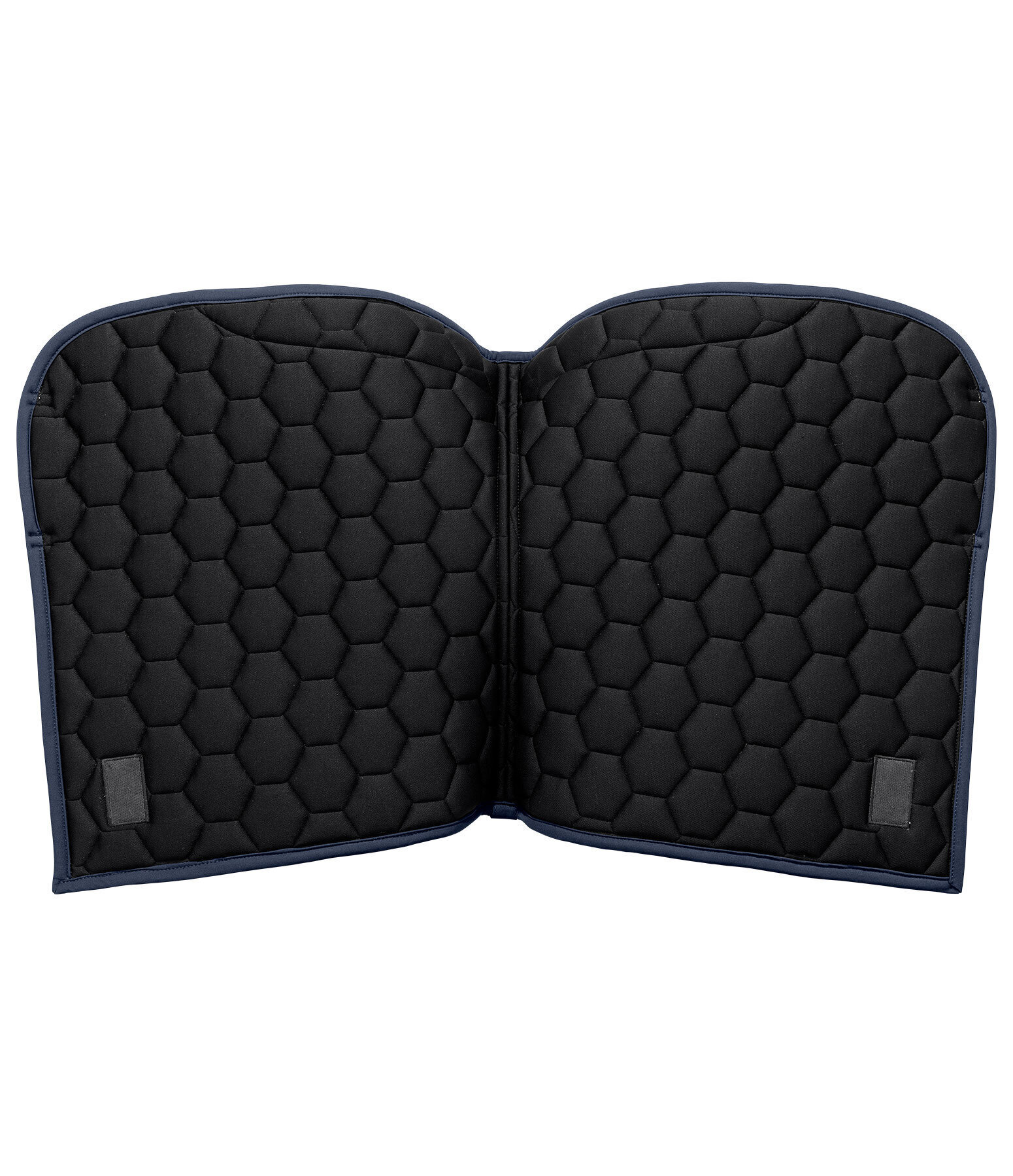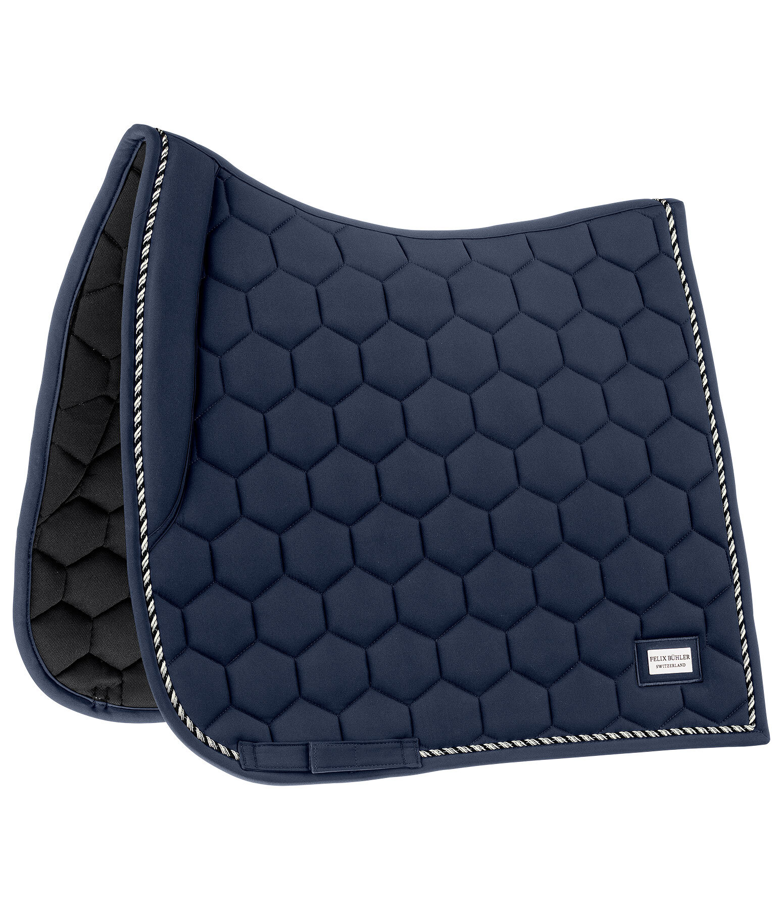 Tapis de selle avec rembourrage à l'avant permettant de garder la selle en place sans passants de contre-sanglons. Coupe sportive avec angle droit et surpiqûre en losanges. Dessus en matière lisse anti-salissures, cordon décoratif de couleur assortie et plaque logo métallique classique. Passants de sangle avec patte auto-agrippante pratique. Dessous en Air mesh respirant et absorbant l'humidité. 100 % polyester.