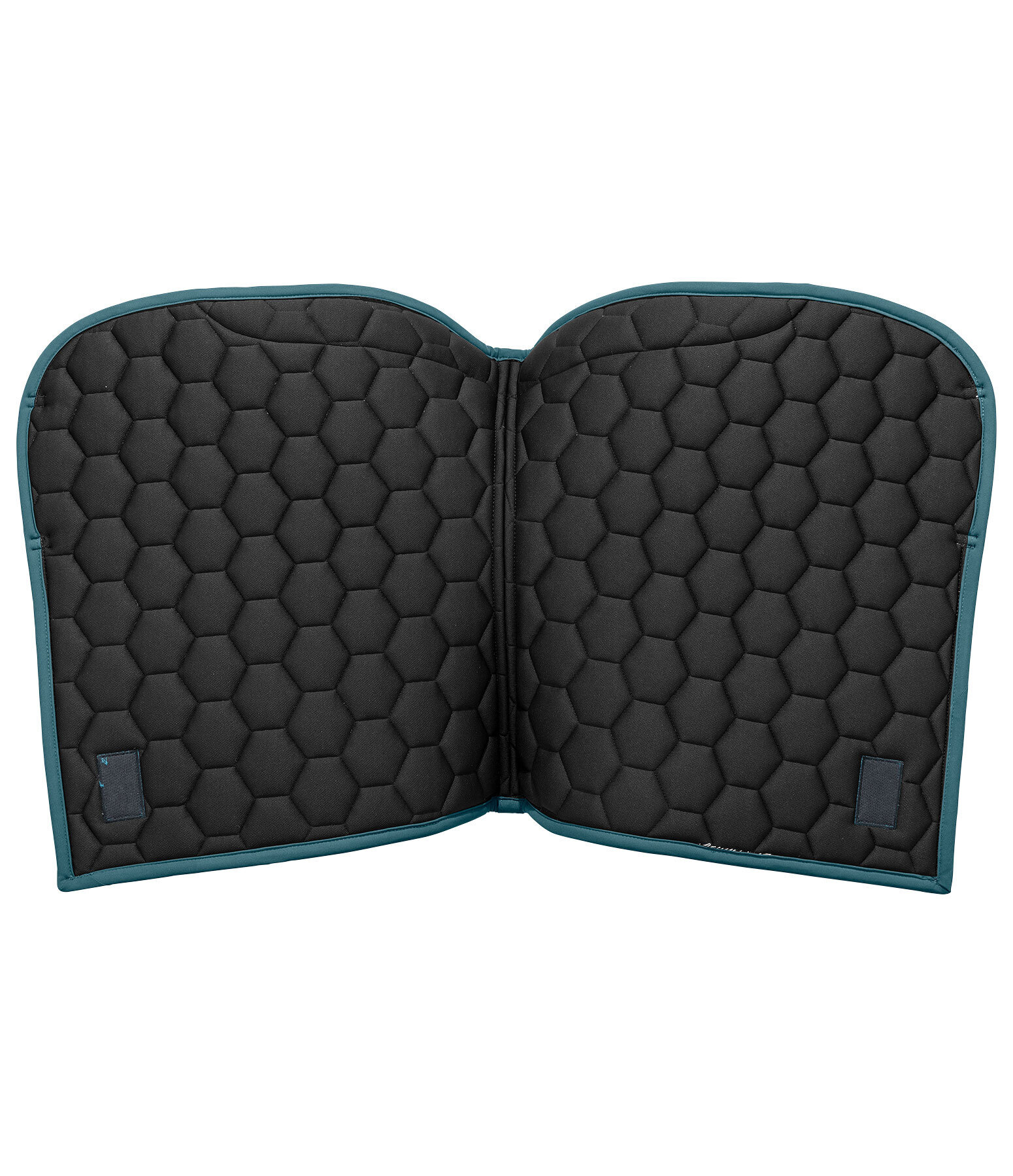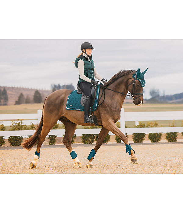 Tapis de selle avec rembourrage à l'avant permettant de garder la selle en place sans passants de contre-sanglons. Coupe sportive avec angle droit et surpiqûre en losanges. Dessus en matière lisse anti-salissures, cordon décoratif de couleur assortie et plaque logo métallique classique. Passants de sangle avec patte auto-agrippante pratique. Dessous en Air mesh respirant et absorbant l'humidité. 100 % polyester.