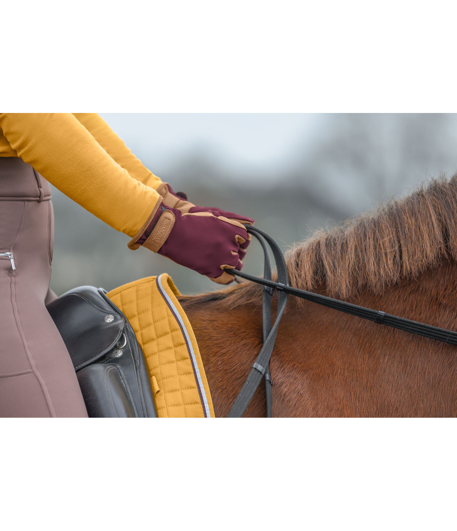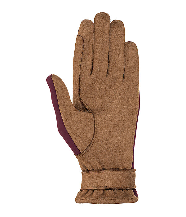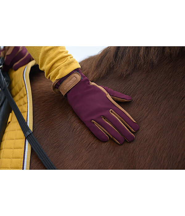 Gants d'équitation d'hiver légers. Dos de la main en Softshell extensible et intérieur doux et souple. Logo en relief sur la patte auto-agrippante. Respirants et coupe-vent. Dessus de la main 71% nylon, 29% élasthanne. Paume 100 % polyester.