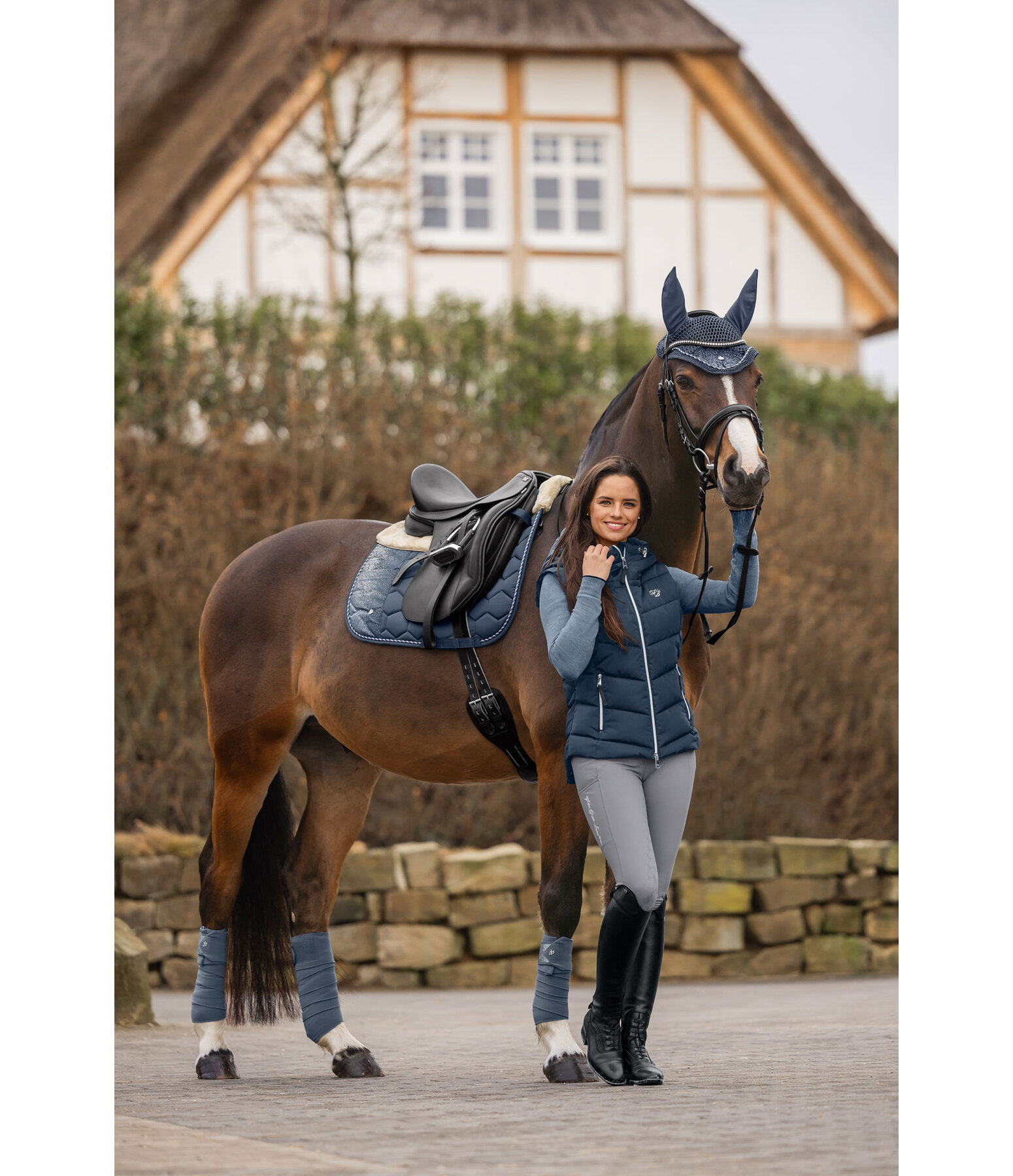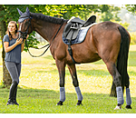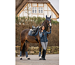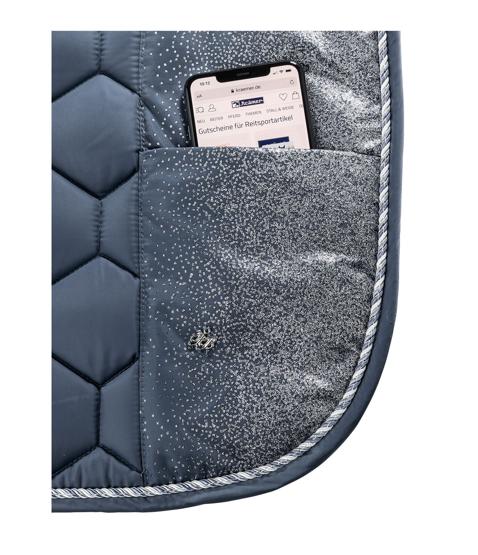 Tapis de selle scintillant. Doublure douce en polaire Teddy au niveau de la selle et au garrot. Poche pour téléphone portable avec fermeture magnétique pratique. Cordon décoratif tressé de plusieurs couleurs avec fil argenté. Dégradé pailleté assorti sur l'arrière-main. Passants de sangle et de contre-sanglons avec patte auto-agrippante pratique. Dessous en Air Mesh respirant et absorbant l'humidité. 100 % polyester.