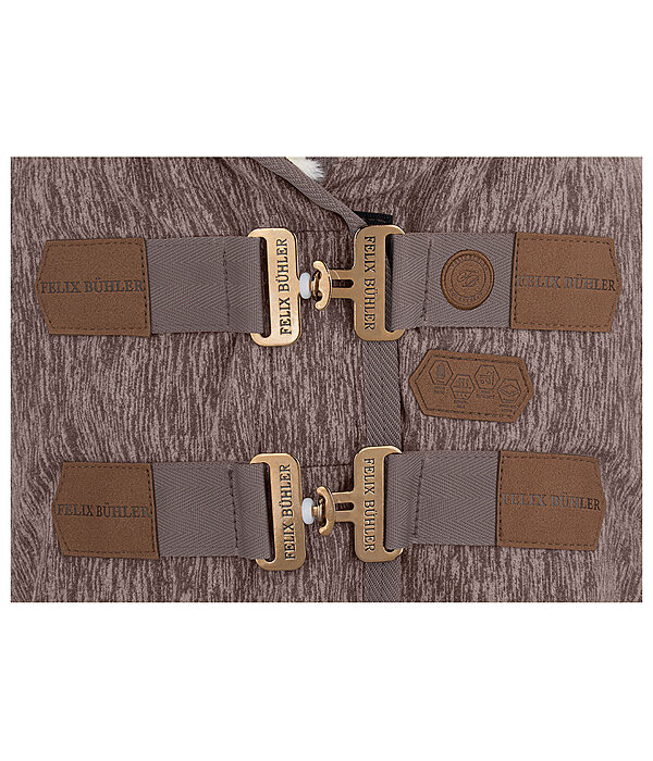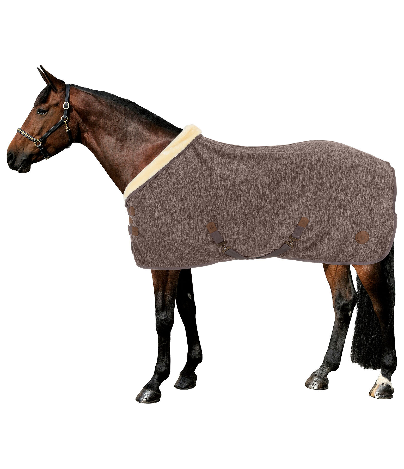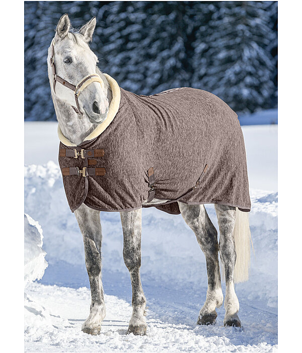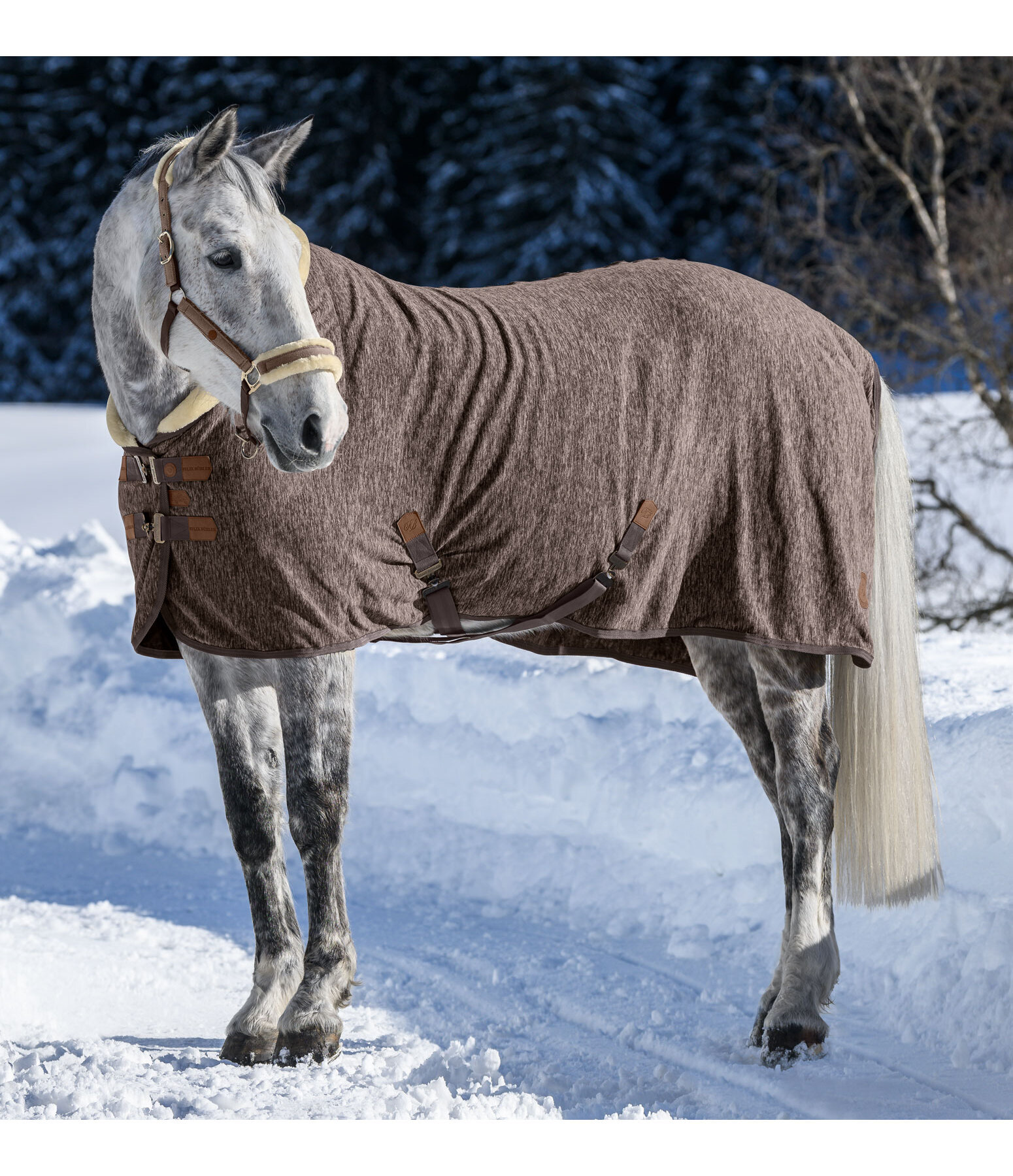 Chemise séchante en tricot polaire chiné avec col en polaire Teddy douce. Assortie à la collection Felix Bühler Knitted. Garde le cheval bien au chaud avant et après le travail et favorise l'évacuation de la transpiration et de l'humidité. Logo en velours synthétique embossé. Double fermeture de poitrail avec crochets en T et patte auto-agrippante supplémentaire, doublure intérieure lisse protégeant la robe au niveau des épaules. Équipée de sursangles croisées et d'une courroie de queue réglables. 100 % polyester.