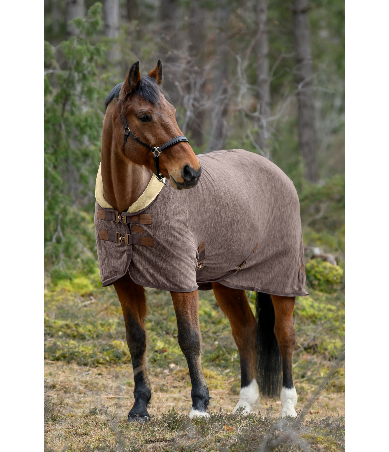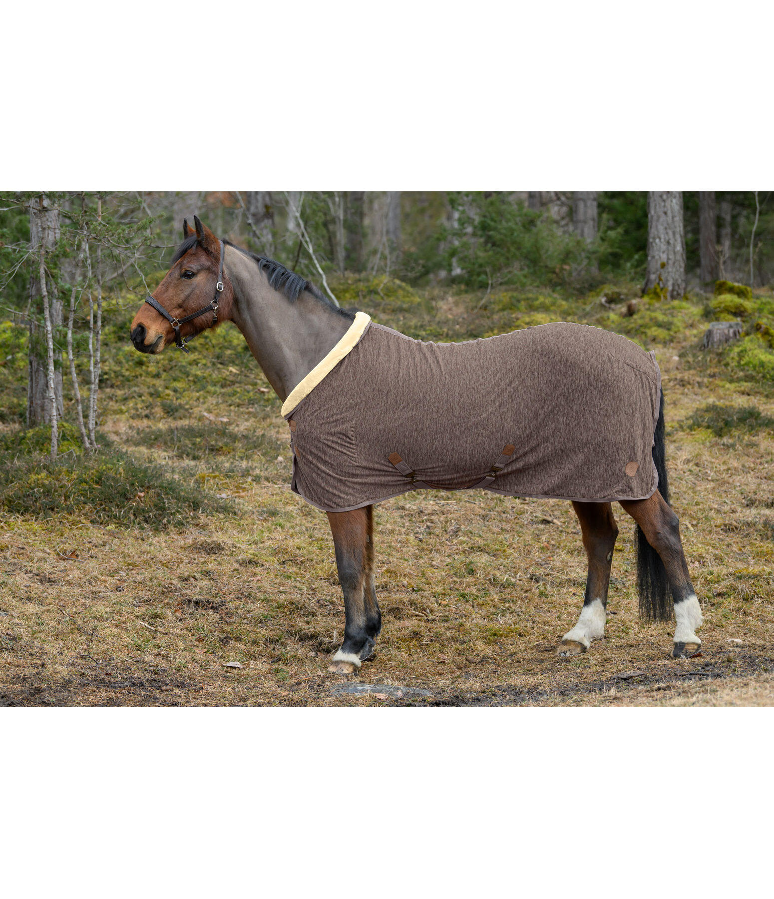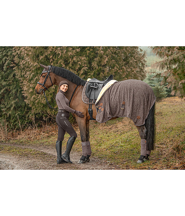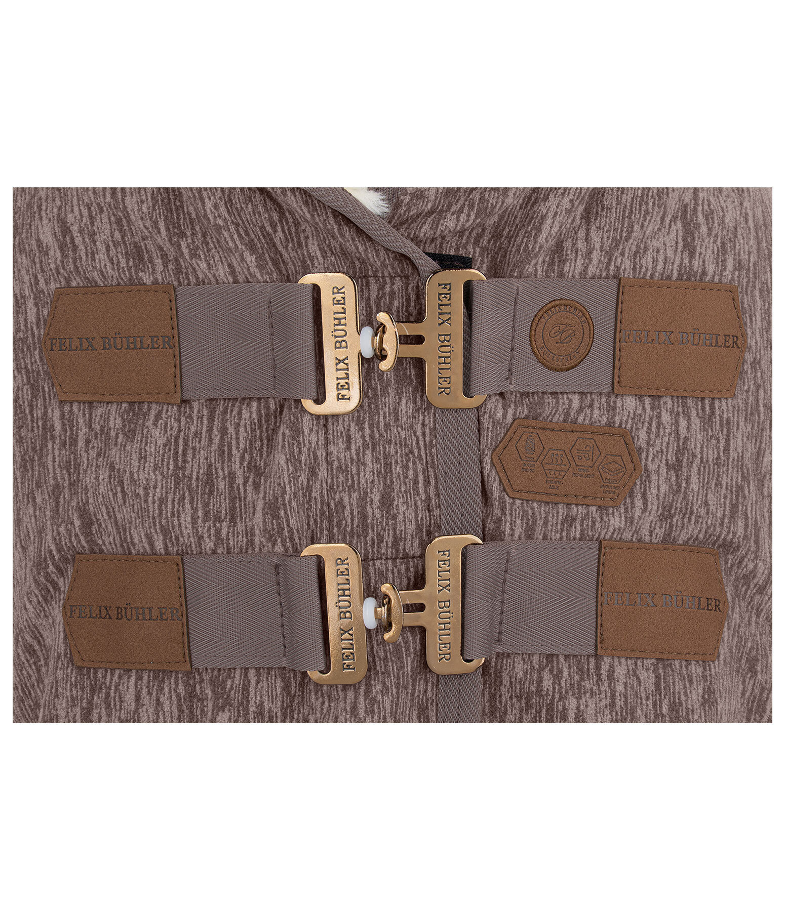 Chemise séchante en tricot polaire chiné avec col en polaire Teddy douce. Assortie à la collection Felix Bühler Knitted. Garde le cheval bien au chaud avant et après le travail et favorise l'évacuation de la transpiration et de l'humidité. Logo en velours synthétique embossé. Double fermeture de poitrail avec crochets en T et patte auto-agrippante supplémentaire, doublure intérieure lisse protégeant la robe au niveau des épaules. Équipée de sursangles croisées et d'une courroie de queue réglables. 100 % polyester.